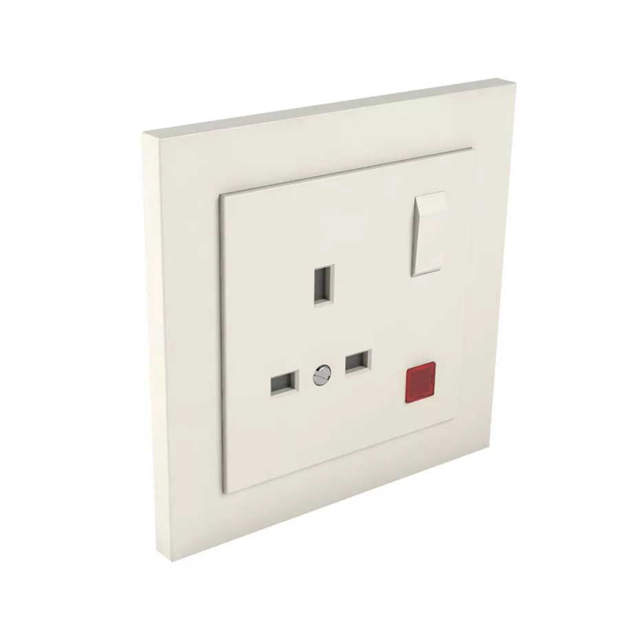 Komplett brit típusú földelt csatlakozó aljzat irányfénnyel, 13A-250V, elefántcsont színű