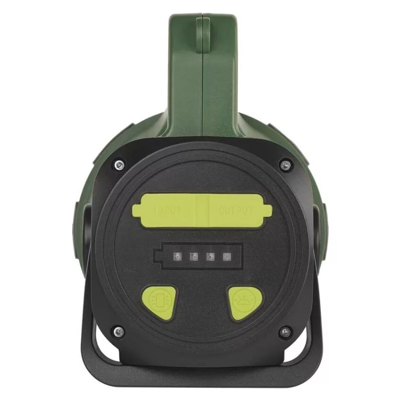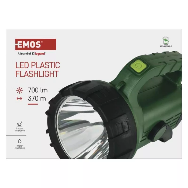 akkumulátor típusa: 3 600 mAh/3,7 V|anyag: ABS műanyag + gumi|a töltés LED jelzése: igen|az akkumulátor állapotának LED-es jelzése: igen|elem a csomag része: igen|értékesítési csomagolás: 1 db, kis papír doboz|feltöltési idő: 4 óra|fényáram: LED + COB LED – 700 lm, LED 100 % – 600 lm, LED 50 % – 300 lm, LED 25 % – 150 lm, COB LED 25 % – 30 lm, COB LED 50 % – 60 lm, COB LED 100 % – 120 lm|fényforrás: LED + COB LED (fehér, piros)|fókusz: nem|garancia-időszak: 2 év|jellemzők: forgatható állvány|márka: EMOS|maximális fényárama: 700 lm|max. világítási távolság: 370 m|méretek: 205 × 125 × 156 mm|speciális funkciók: gyors kikapcsolási funkció, akkumulátor védelmi funkció, powerbank funkció|súly: 500 g|szín: zöld-fekete|táplálás: Li-Ion akupack|tartozékok: USB kábel, heveder|tölthető: igen|töltőcsatlakozó típusa: USB C|ütésállóság: igen|üzemidő részletezés: LED + COB LED – 3 óra, LED 100 % – 4 óra, LED 50 % – 5 óra, LED 25 % – 11 óra, COB LED 25 % – 40 óra, COB LED 50 % – 20 óra, COB LED 100 % – 9 óra|üzemmódok: LED + COB LED, LED 100 %, LED 50 %, LED 25 %, LED villogás, COB LED 25 %, LED 50 %, LED 100 %, COB LED piros - 100 %, COB LED piros - lassú villogás, COB LED piros - gyors villogás|világítási idő: 4–11 óra|világítási távolság: LED + COB LED – 370 m, LED 100 % – 370 m, LED 50 % – 250 m, LED 25 % – 160 m, COB LED 25 % – 8 m, COB LED 50 % – 10 m, COB LED 100 % – 16 m|világítási üzemmódok száma: 10+|vízálló: igen (IP43)
