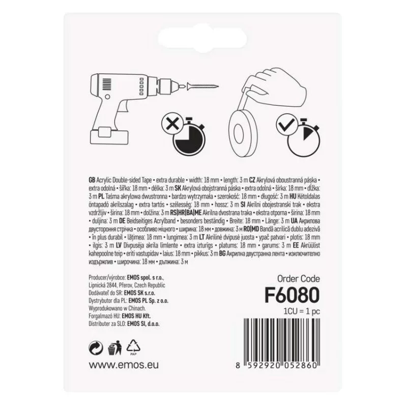 ajánlott tárolási hőmérséklet: 5–40 °C|A REACH irányelveinek megfelelő: nincs megadva|A ROHS irányelveinek megfelelő: nincs megadva|a szalag szélessége: 18 mm|a szalag vastagsága: 1,00 mm|a tekercs hossza: 3 m|értékesítési csomagolás: 1 db, bliszter|integrált szövetháló: nincs megadva|javasolt alkalmazás: hobbi, műhely, kert|lángállóság vizsgálat: nincs megadva|maximális megnyúlás: nincs megadva|megfelel a következő normáknak: nincs megadva|méretek: 88 × 18 mm|minimális dielektromos (átütési) szilárdság: nincs megadva|minimális dielektromos (átütési) szilárdság nedvesedés után: nincs megadva|nyomásálló illesztés létrehozása: nem|nyomtatás: nyomtatás nélkül|önoltó: igen|ragasztóanyag: akril|szakítószilárdság: nincs megadva|szalag típusa: akril kétoldalú szalag|szín: átlátszó|tapadás acélhoz - minimális: nincs megadva|tapadás az anyaghoz: 2 kg/30 cm|telepítési hőmérséklet-tartomány: 5–40 °C|UV-ellenálló: igen|vízálló csatlakozás: nincs megadva