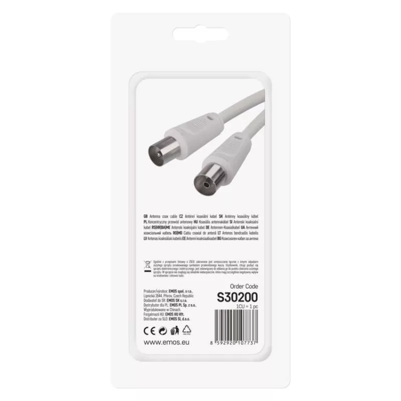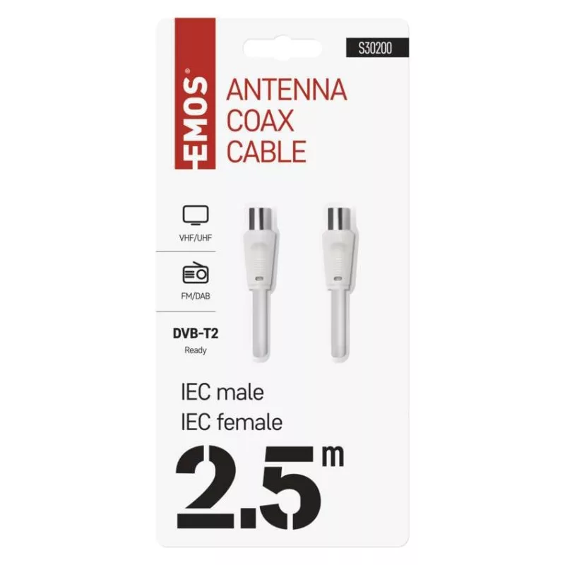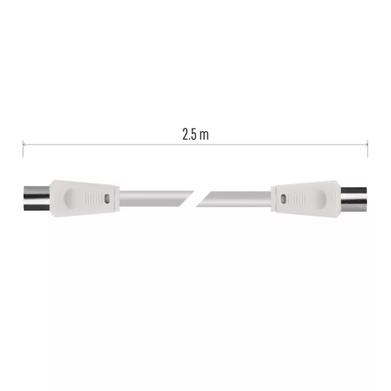 Koaxiális antennakábel IEC csatlakozódugóval és csatlakozóhüvellyel. A kábel kettős árnyékolású az elektromágneses interferencia csökkentése érdekében. 2,5 m-es kábelhossz.A koaxiális kábel használható műholdvevőhöz, digitális vevőkészülékhez, antennához, átalakítóhoz, síkképernyős tévéhez és hagyományos televízióhoz.