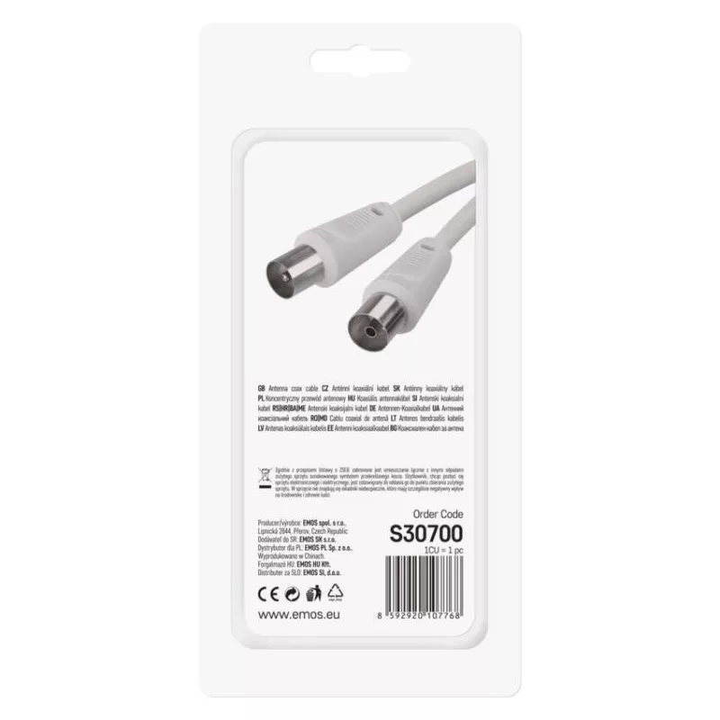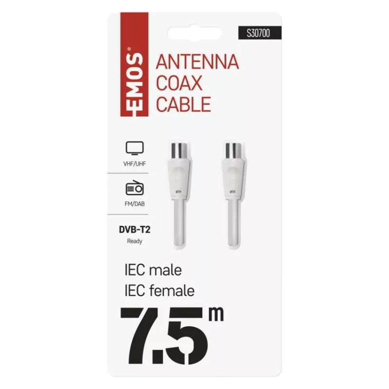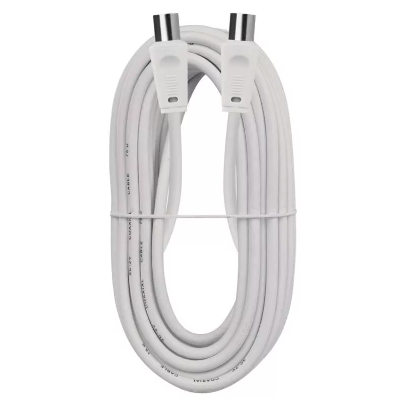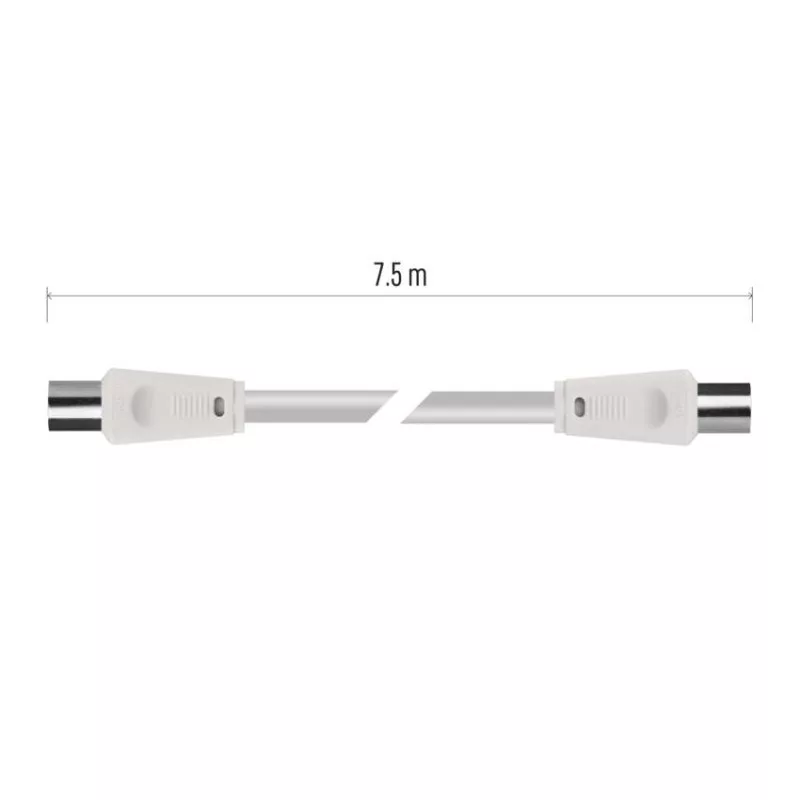 Koaxiális antennakábel IEC csatlakozódugóval és csatlakozóhüvellyel. A kábel kettős árnyékolású az elektromágneses interferencia csökkentése érdekében. 7,5 m-es kábelhossz.A koaxiális kábel használható műholdvevőhöz, digitális vevőkészülékhez, antennához, átalakítóhoz, síkképernyős tévéhez és hagyományos televízióhoz.