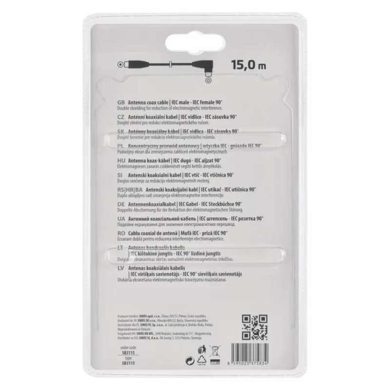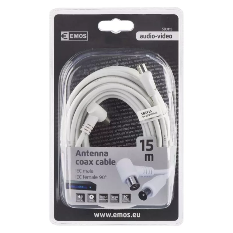 Koaxiális antennakábel IEC csatlakozódugóval és csatlakozóhüvellyel. A kábel 90°-os hajlított csatlakozóval rendelkezik. A kábel kettős árnyékolású az elektromágneses interferencia csökkentése érdekében. 15 m-es kábelhossz.A koaxiális kábel használható műholdvevőhöz, digitális vevőkészülékhez, antennához, átalakítóhoz, síkképernyős tévéhez és hagyományos televízióhoz.
