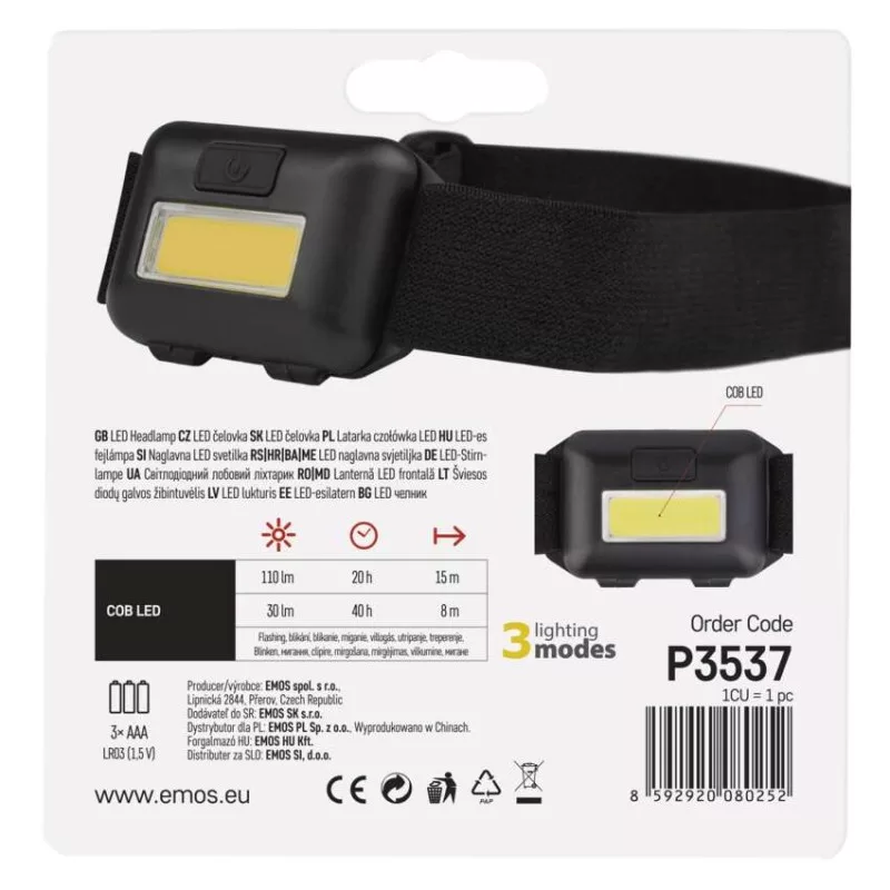 akkumulátor típusa: LR03 (1,5 V)|anyag: ABS műanyag|a töltés LED jelzése: nincs megadva|az akkumulátor állapotának LED-es jelzése: nincs megadva|elem a csomag része: nem|értékesítési csomagolás: 1 db, papírbliszter|feltöltési idő: nincs megadva|fényáram: COB LED 100 % – 110 lm, COB LED 50 % – 30 lm|fényforrás: COB LED|fényvisszaverő szalag: nem|fókusz: nem|garancia-időszak: 2 év|jellemzők: nincs megadva|márka: EMOS|max. hatótávolság: 15 m|maximális fényáram: 110 lm|méretek: 60 × 18 × 40 mm|speciális funkciók: nincs megadva|sugárzási szög: 110°|súly: 21 g/56 g|szín: fekete|táplálás: 3× AAA|tartozékok: nincs megadva|tölthető: nem|töltőcsatlakozó típusa: nincs megadva|ütésállóság: igen|üzemidő részletezés: COB LED 100 % – 20 h, COB LED 50 % – 40 h|üzemmódok: COB LED 100 %, COB LED 50 %, villog|világítási idő: 20–40 óra|világítási távolság: COB LED 100 % – 15 m, COB LED 50 % – 8 m|világítási üzemmódok száma: 3|vízálló: nem
