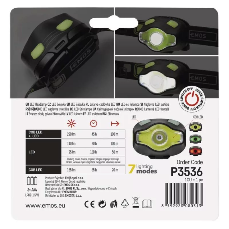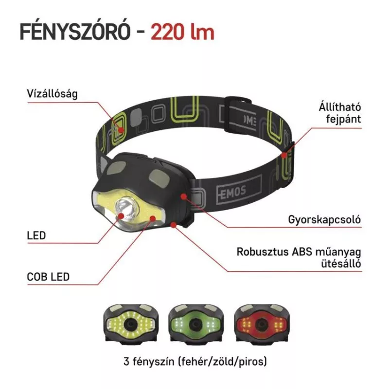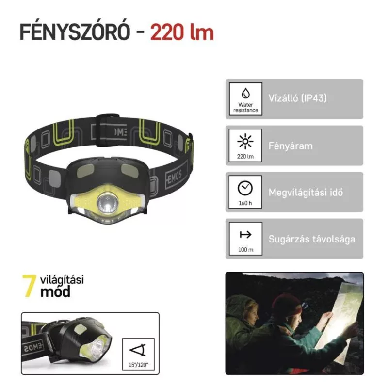 akkumulátor típusa: LR03 (1,5 V)|anyag: ABS műanyag|a töltés LED jelzése: nincs megadva|az akkumulátor állapotának LED-es jelzése: nincs megadva|elem a csomag része: nem|értékesítési csomagolás: 1 db, papírbliszter|feltöltési idő: nincs megadva|fényáram: COB LED + LED 100 % – 220 lm, LED 100 % – 110 lm, LED 50 % – 25 lm, COB LED 100 % – 155 lm|fényforrás: LED + COB LED (zöld, piros)|fényvisszaverő szalag: igen|fókusz: nem|garancia-időszak: 2 év|jellemzők: foszforeszkáló kapcsoló|márka: EMOS|max. hatótávolság: 100 m|maximális fényáram: 220 lm|méretek: 65 × 45 × 50 mm|speciális funkciók: gyors be-/kikapcsolás|sugárzási szög: 15°/120°|súly: 65 g/100 g|szín: fekete|táplálás: 3× AAA|tartozékok: nincs megadva|tölthető: nem|töltőcsatlakozó típusa: nincs megadva|ütésállóság: igen|üzemidő részletezés: COB LED + LED 100 % – 45 h, LED 100 % – 70 h, LED 50 % – 160 h, COB LED 100 % – 65 h|üzemmódok: COB LED + LED 100 %, LED 100 %, LED 50 %, villog, COB LED – fehér, COB LED – piros, COB LED – zöld|világítási idő: 45–160 óra|világítási távolság: COB LED + LED 100 % – 100 m, LED 100 % – 100 m, LED 50 % – 50 m, COB LED 100 % – 20 m|világítási üzemmódok száma: 7|vízálló: igen (IP43)