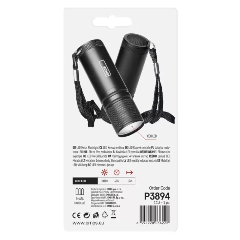 akkumulátor típusa: LR03 (1,5 V)|anyag: alumínium|a töltés LED jelzése: nincs megadva|az akkumulátor állapotának LED-es jelzése: nincs megadva|elem a csomag része: nem|értékesítési csomagolás: 1 db, bliszter|feltöltési idő: nincs megadva|fényáram: COB LED 100 % – 100 lm|fényforrás: COB LED|fókusz: nem|garancia-időszak: 2 év|jellemzők: hurok|márka: EMOS|maximális fényárama: 100 lm|max. világítási távolság: 15 m|méretek: 85 × 25 × 25 mm|speciális funkciók: nincs megadva|súly: 34 g|szín: fekete|táplálás: 3× AAA|tartozékok: nincs megadva|tölthető: nem|töltőcsatlakozó típusa: nincs megadva|ütésállóság: igen|üzemidő részletezés: COB LED 100 % – 35 óra|üzemmódok: COB LED 100 %|világítási idő: 35 óra|világítási távolság: COB LED 100 % – 15 m|világítási üzemmódok száma: 1|vízálló: igen (IP43)