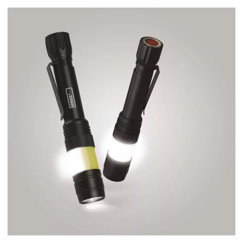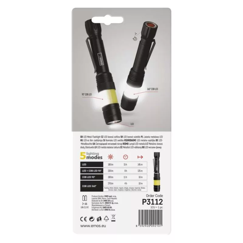 akkumulátor típusa: LR6 (1,5 V)|anyag: alumínium|a töltés LED jelzése: nincs megadva|az akkumulátor állapotának LED-es jelzése: nincs megadva|elem a csomag része: nem|értékesítési csomagolás: 1 db, papírbliszter|feltöltési idő: nincs megadva|fényáram: LED – 180 lm, LED + COB LED 90° – 230 lm, COB LED 90° – 100 lm, COB LED 360° – 270 lm|fényforrás: COB LED + LED|fókusz: nem|garancia-időszak: 2 év|jellemzők: klipp, 1× mágnes|márka: EMOS|maximális fényárama: 270 lm|max. világítási távolság: 145 m|méretek: 171 × 30 × 30 mm|speciális funkciók: nincs megadva|súly: 108 g|szín: fekete|táplálás: 2× AA|tartozékok: nincs megadva|tölthető: nem|töltőcsatlakozó típusa: nincs megadva|ütésállóság: igen|üzemidő részletezés: LED – 15 óra, LED + COB LED 90° – 8 óra, COB LED 90° – 11 óra, COB LED 360° – 4 óra|üzemmódok: LED, LED + COB LED 90°, COB LED 90°, COB LED 360°, COB LED 360° villogó|világítási idő: 4–15 óra|világítási távolság: LED – 145 m, LED + COB LED 90° – 125 m, COB LED 90° – 10 m, COB LED 360° – 10 m|világítási üzemmódok száma: 5|vízálló: igen (IP44)