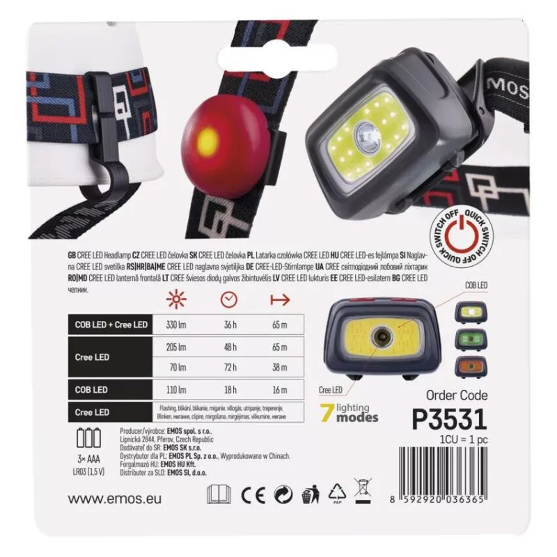 akkumulátor típusa: LR03 (1,5 V) + CR2032 (3 V)|anyag: ABS műanyag|a töltés LED jelzése: nincs megadva|az akkumulátor állapotának LED-es jelzése: nincs megadva|elem a csomag része: 1× CR2032|értékesítési csomagolás: 1 db, papírbliszter|feltöltési idő: nincs megadva|fényáram: COB LED + CREE LED 100 % – 330 lm, CREE LED 100 % – 205 lm, CREE LED 50 % – 70 lm, COB LED 100 % – 110 lm|fényforrás: CREE LED + COB LED (zöld, piros) + piros LED (hatsó lámpa)|fényvisszaverő szalag: igen|fókusz: nem|garancia-időszak: 2 év|jellemzők: hátsó piros LED lámpa, hangjelzés, kampó|márka: EMOS|max. hatótávolság: 65 m|maximális fényáram: 330 lm|méretek: 65 × 32 × 39 mm|speciális funkciók: gyors be-/kikapcsolás|sugárzási szög: 25°/110°|súly: 80 g/115 g|szín: szürke|táplálás: 3× AAA + 1× CR2032|tartozékok: sisakkampók|tölthető: nem|töltőcsatlakozó típusa: nincs megadva|ütésállóság: igen|üzemidő részletezés: COB LED + CREE LED 100 % – 36 h, CREE LED 100 % – 48 h, CREE LED 50 % – 72 h, COB LED 100 % – 18 h|üzemmódok: COB LED + CREE LED 100 %, CREE LED 100 %, CREE LED 50 %, CREE LED – villog, COB LED – fehér, COB LED – zöld, COB LED – piros|világítási idő: 18–72 óra|világítási távolság: COB LED + CREE LED 100 % – 65 m, CREE LED 100 % – 65 m, CREE LED 50 % – 38 m, COB LED 100 % – 16 m|világítási üzemmódok száma: 7|vízálló: igen (IP44)
