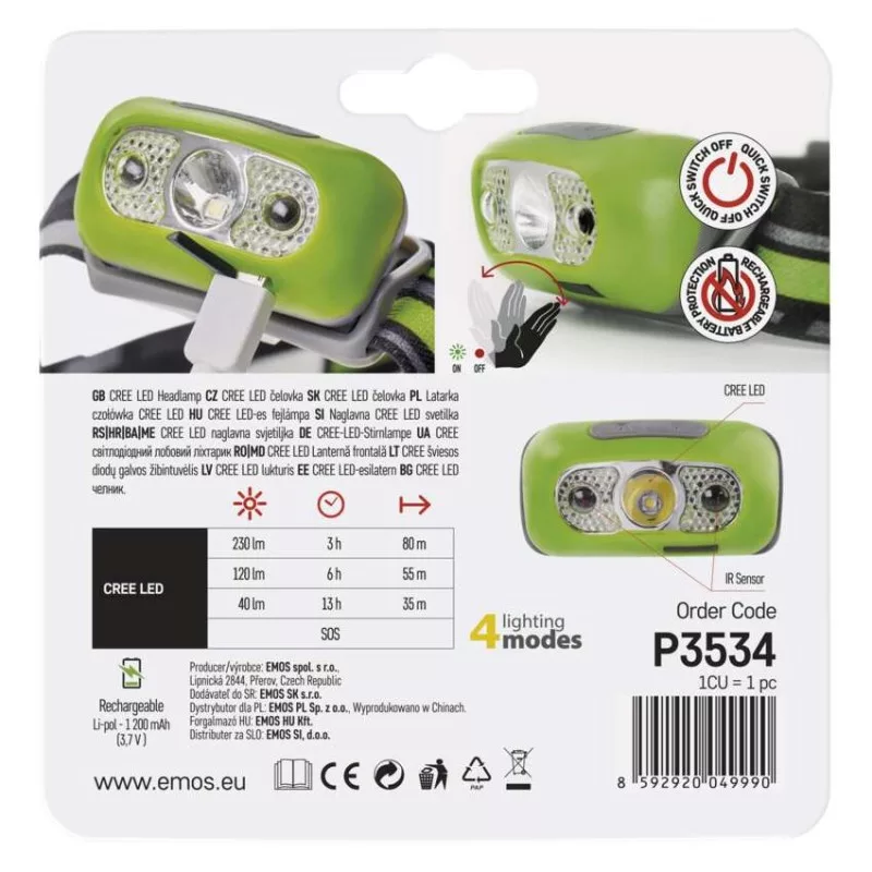 akkumulátor típusa: 1 200 mAh (3,7 V)|anyag: ECO–PC műanyag|a töltés LED jelzése: igen|az akkumulátor állapotának LED-es jelzése: nem|elem a csomag része: igen|értékesítési csomagolás: 1 db, papírbliszter|feltöltési idő: 3 h|fényáram: CREE LED 100 % – 230 lm, CREE LED 50 % – 120 lm, CREE LED 20 % – 40 lm|fényforrás: CREE LED|fényvisszaverő szalag: igen|fókusz: nem|garancia-időszak: 2 év|jellemzők: nincs megadva|márka: EMOS|max. hatótávolság: 80 m|maximális fényáram: 230 lm|méretek: 61 × 37 × 31 mm|speciális funkciók: kézi átkapcsolás, gyors be-/kikapcsolás, akkumulátorvédelem|sugárzási szög: 30°|súly: 60 g|szín: zöld|táplálás: Li-pol|tartozékok: tápkábel|tölthető: igen|töltőcsatlakozó típusa: micro USB B|ütésállóság: igen|üzemidő részletezés: CREE LED 100 % – 3 h, CREE LED 50 % – 6 h, CREE LED 20 % – 13 h|üzemmódok: CREE LED 100 %, CREE LED 50 %, CREE LED 20 %, SOS|világítási idő: 3–13 óra|világítási távolság: CREE LED 100 % – 80 m, CREE LED 50 % – 55 m, CREE LED 20 % – 35 m|világítási üzemmódok száma: 4|vízálló: nem