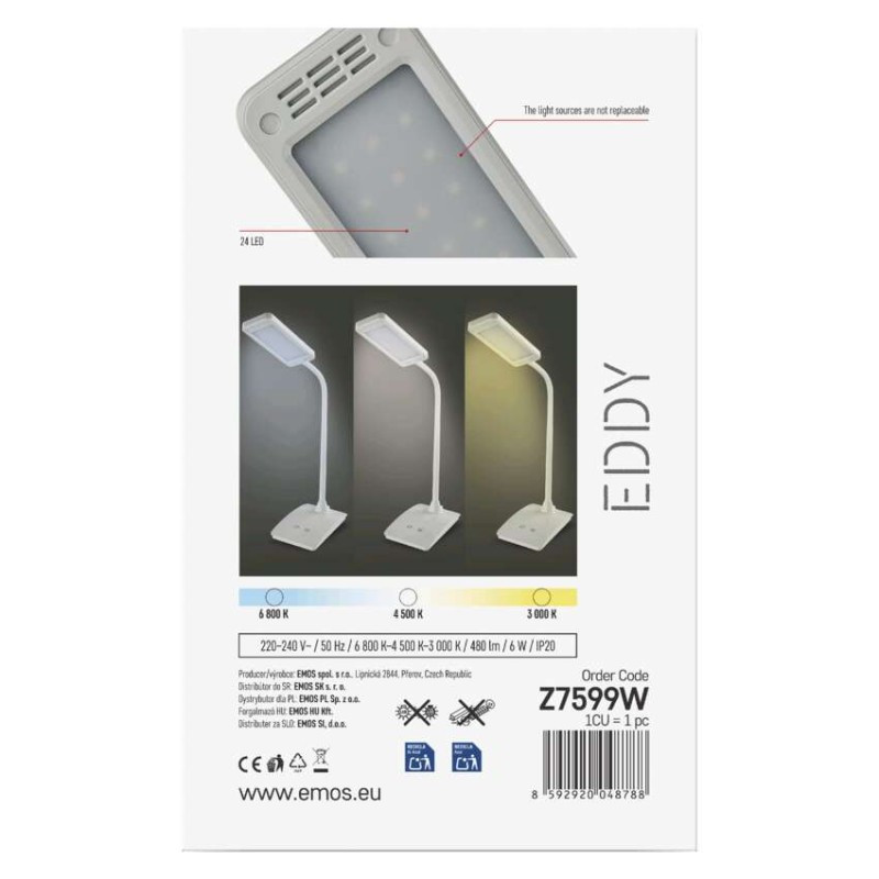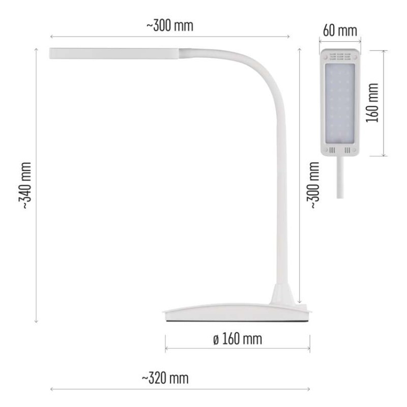 anyag: műanyag + fém|beépített tölthető elem: nem|bemelegedési idő 100 %-ra: 0 s|dimmelhetőség: igen|élettartam: 30 000 óra|energiaosztály: –|energiaosztály (2021.9. -től): G|értékesítési csomagolás: 1 db, doboz|fényáram: 480 lm|fény színe: meleg/természetes/hideg fehér|feszültség: 220–240 V|foglalat: –|fogyasztás: 6 W|higanytartalom: <0 mg|kapcsolási ciklusok száma: 75 000|LED chip: SMD|LED-ek száma: 24|max. teljesítmény: 6 W|méretek: 170 × 105 × 350 mm|öregedési tényező: 75 %|szín: fehér|színhőmérséklet: 3 000/4 500/6 800 K|színvisszaadási index (CRI): Ra > 83|tápegység: 12 V/0,36 A|tápegység (tartozék): igen|tápellátás típusa: elektromos hálózat|tápkábel hossza: 1,8 m|teljesítménytényező: 0,85|USB port: nem|védettség: IP20