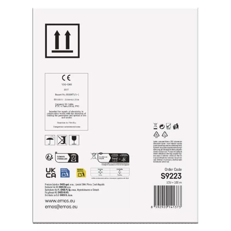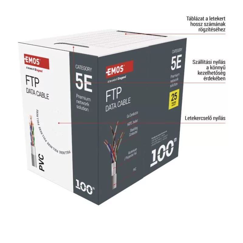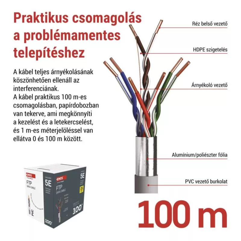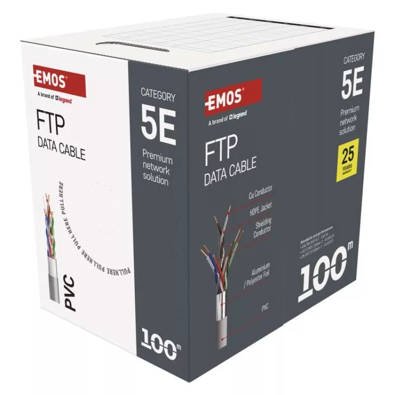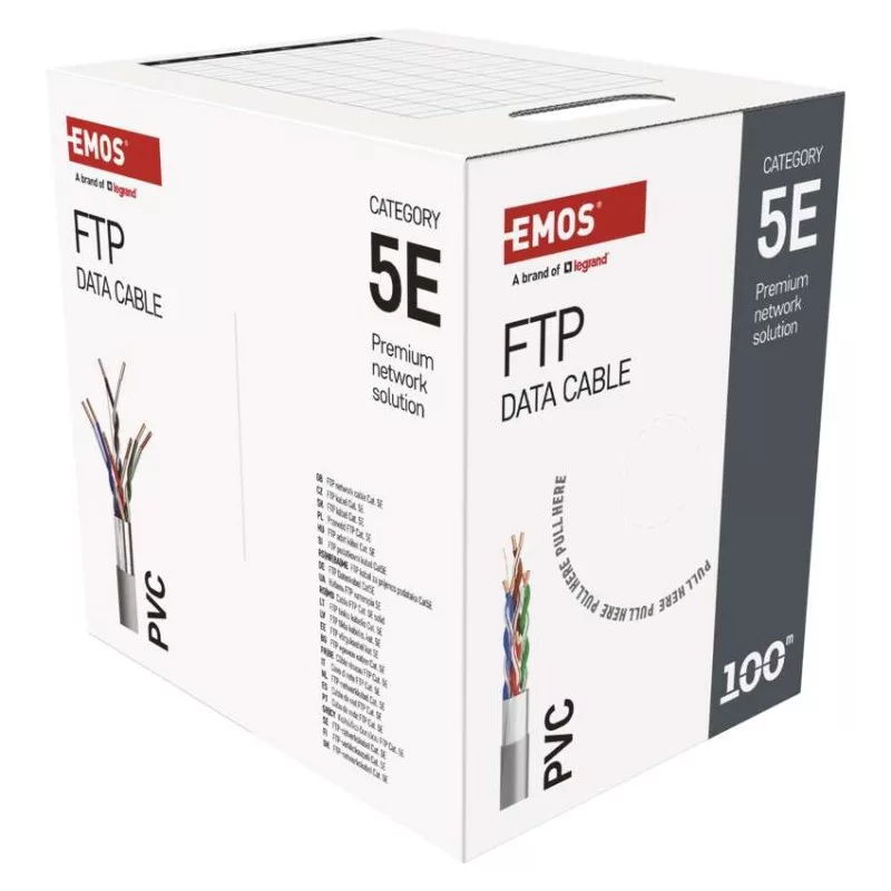 a belső vezeték anyaga: vörösréz (Cu)|árnyékolás: nem|AWG: 24|belső vezető ér átmérője: 0,51 mm|csatlakozók: nincs megadva|csatlakozó védő típusa: nincs megadva|értékesítési csomagolás: 100 m, papír doboz|garancia-időszak: 25 év|használat: professional|hossz: 100 m|kábelátmérő: 5 mm|kábelburkolat vastagsága: 1,0 mm|kábelhez tervezve: nincs megadva|kábel jelölése: FTP Cat5E PVC 1 – 100 m|kábelköpeny: PVC|kábelszerkezet: vezeték|kategória: CAT5E|köpeny kevesebb füstkibocsátással LSZH (LS0H): nem|köpeny színe: szürke (RAL 7035)|legmagasabb támogatott protokoll: 1000 Base-TX (Gigabit Ethernet)|maximális üzemi nedvesség: 93 %|rögzítési hőmérséklet: +5 °C és +60 °C|szilárdsági elem: nincs megadva|tárolási hőmérséklet: -20 °C és +60 °C|termék: FTP kábel csatlakozók nélkül|típus: FTP CAT 5E PVC|tűzveszélyességi osztály: Eca|veszélyes anyagok: nincs|vezetékek száma: 8|vezeték szigetelése: HDPE|vezető ér szigetelésének vastagsága: 0,22 mm