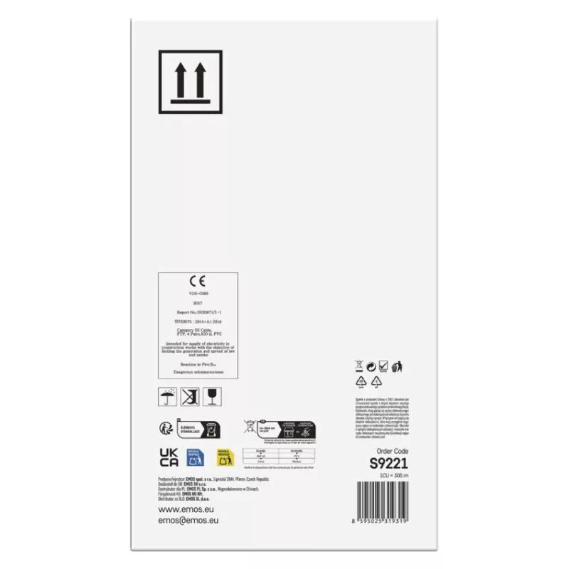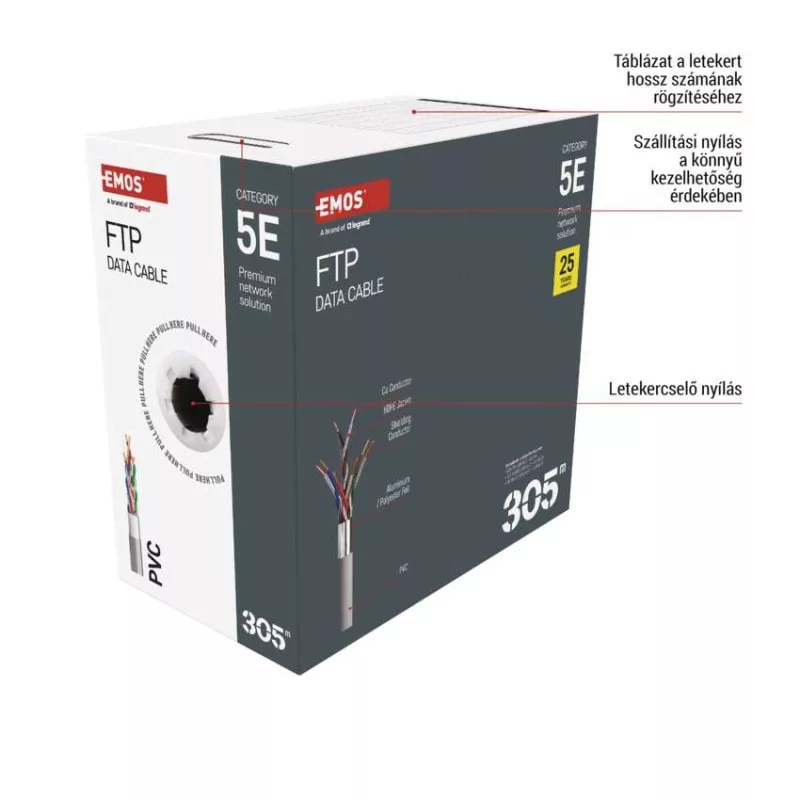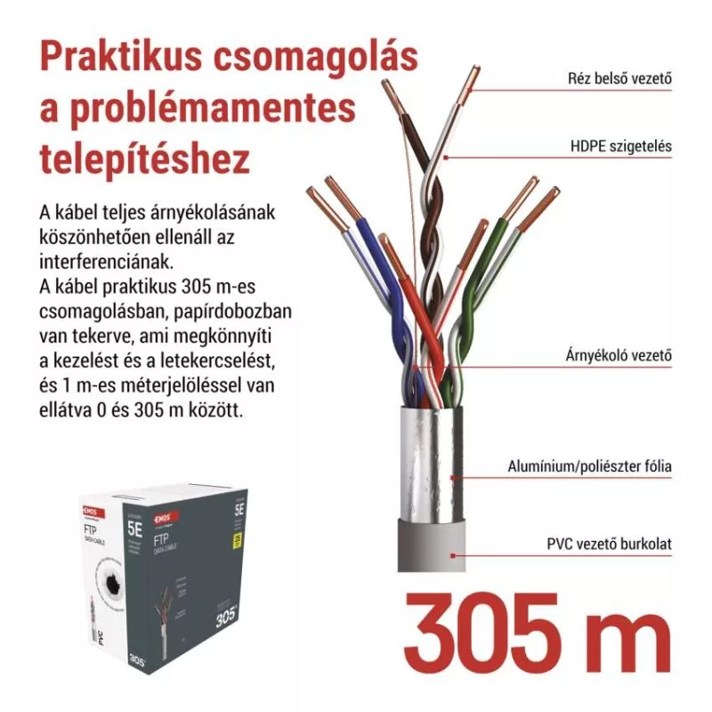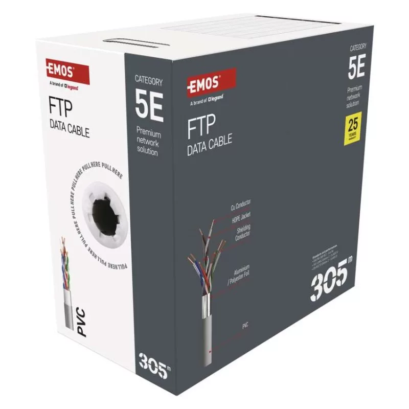 a belső vezeték anyaga: vörösréz (Cu)|árnyékolás: Al/PET 7/12–18 mm|AWG: 24|belső vezető ér átmérője: 0,51 mm|csatlakozók: nem|csatlakozó védő típusa: nem|értékesítési csomagolás: 305 m, papír doboz|garancia-időszak: 25 év|használat: nincs megadva|hossz: 305 m|kábelátmérő: 6,0 mm|kábelburkolat vastagsága: 1,0 mm|kábelhez tervezve: nincs megadva|kábel jelölése: FTP Cat5E PVC 1 – 305 m|kábelköpeny: PVC|kábelszerkezet: vezeték|kategória: 5E|köpeny kevesebb füstkibocsátással LSZH (LS0H): nem|köpeny színe: szürke (RAL 7035)|legmagasabb támogatott protokoll: 1000 Base-T (Gigabit Ethernet)|maximális üzemi nedvesség: 93 %|rögzítési hőmérséklet: +5 °C és +60 °C|szilárdsági elem: Nylon 150D|tárolási hőmérséklet: -20 °C és +60 °C|termék: FTP kábel csatlakozók nélkül|típus: FTP CAT 5E PVC|tűzveszélyességi osztály: Eca|veszélyes anyagok: nincs|vezetékek száma: 8+1|vezeték szigetelése: HDPE|vezető ér szigetelésének vastagsága: 0,22 mm