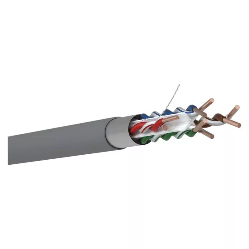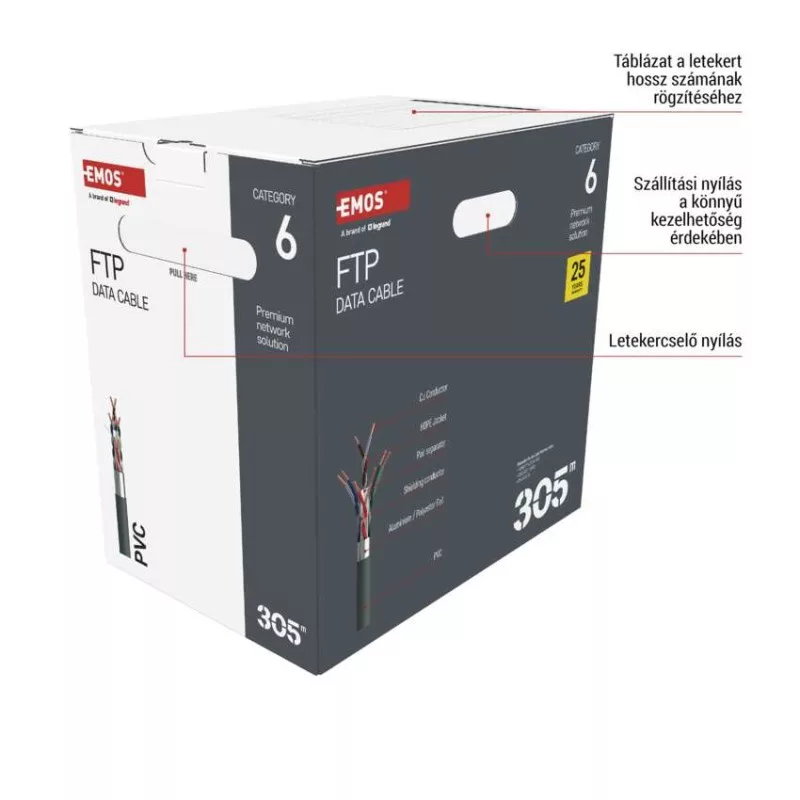a belső vezeték anyaga: vörösréz (Cu)|árnyékolás: nem|AWG: 23|belső vezető ér átmérője: 0,56 mm|csatlakozók: nincs megadva|csatlakozó védő típusa: nincs megadva|értékesítési csomagolás: 305 m, papír doboz|garancia-időszak: 25 év|használat: beltéri|hossz: 305 m|kábelátmérő: 6,0 mm|kábelburkolat vastagsága: 1,0 mm|kábelhez tervezve: nincs megadva|kábel jelölése: FTP CAT 6 PVC 1 – 305 m|kábelköpeny: PVC|kábelszerkezet: vezeték|kategória: CAT6|köpeny kevesebb füstkibocsátással LSZH (LS0H): nem|köpeny színe: szürke (RAL 7035)|legmagasabb támogatott protokoll: 100 Base-TX|maximális üzemi nedvesség: 93 %|rögzítési hőmérséklet: +5 °C és +60 °C|szilárdsági elem: Nylon 150D|tárolási hőmérséklet: -20 °C és +60 °C|termék: FTP kábel csatlakozók nélkül|típus: FTP CAT 6 PVC|tűzveszélyességi osztály: Eca|veszélyes anyagok: nincs|vezetékek száma: 8|vezeték szigetelése: HDPE|vezető ér szigetelésének vastagsága: 0,21 mm