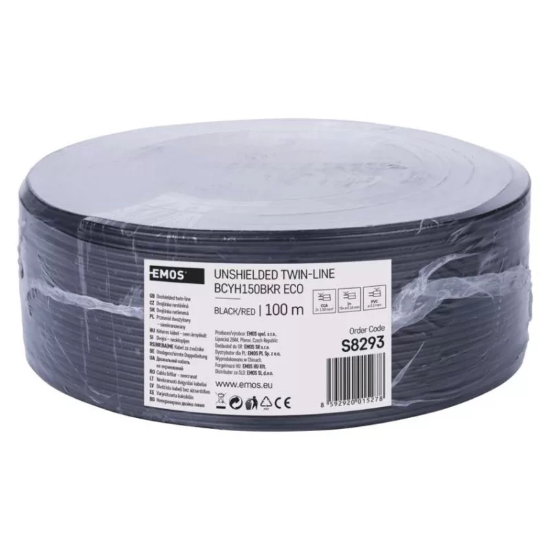 a belső vezeték anyaga: rézzel bevont alumínium (CCA)|a belső vezeték átmérője: 133× 0,12 mm|a belső vezeték szigetelésének színe: nincs|árnyékolás: nem|árnyékoló vezetékek száma: nincs|a vezeték árnyékolásának anyaga: nincs|a vezeték árnyékolásának keresztmetszete: nincs|bevonat anyaga: PVC|csomagolás típusa – hossz: 100 m|értékesítési csomagolás: 100 m, PE fólia|garancia-időszak: 2 év|javasolt alkalmazás: alacsony feszültségű átvitel|kettős szigetelés: nem|köpeny színe: fekete, piros és fekete|külső szigetelés: 2× 3,5 mm|maximális üzemi feszültség: 50 V|típus meghatározása: SP150/Bkr ECO|vezeték keresztmetszet: 1,5 mm²
