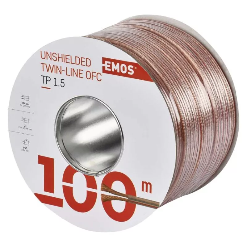 a belső vezeték anyaga: oxigénmentes réz (Cu)|a belső vezeték átmérője: 210× 0,095 mm|a belső vezeték szigetelésének színe: nincs|árnyékolás: nem|árnyékoló vezetékek száma: nincs|a vezeték árnyékolásának anyaga: nincs|a vezeték árnyékolásának keresztmetszete: nincs|bevonat anyaga: PVC|csomagolás típusa – hossz: 100 m|értékesítési csomagolás: 100 m, tekercs|garancia-időszak: 5 év|javasolt alkalmazás: hangszóró csatlakozás|kettős szigetelés: nem|köpeny színe: átlátszó, átlátszó|külső szigetelés: 2× 3,6 mm|maximális üzemi feszültség: 50 V|típus meghatározása: SP150/TP|vezeték keresztmetszet: 1,5 mm²
