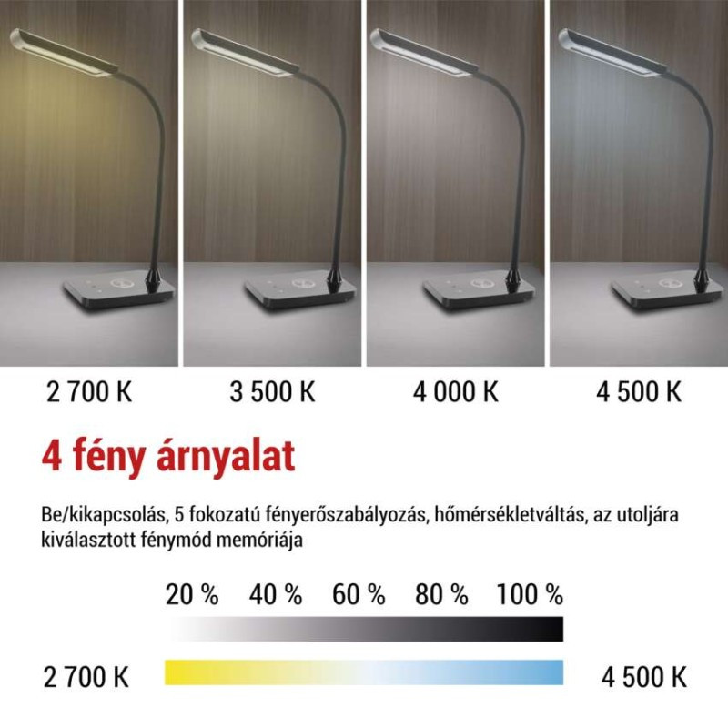 anyag: ABS műanyag|beépített tölthető elem: nem|bemelegedési idő 100 %-ra: nincs megadva|dimmelhetőség: igen|élettartam: nincs megadva|energiaosztály: nincs megadva|energiaosztály (2021.9. -től): nincs megadva|értékesítési csomagolás: 1 db, doboz|fényáram: 300 lm|fény színe: meleg/természetes/hideg fehér|feszültség: 220–240 V|foglalat: nincs megadva|fogyasztás: 5,5 W|higanytartalom: nincs megadva|kapcsolási ciklusok száma: nincs megadva|LED chip: SMD|LED-ek száma: nincs megadva|max. teljesítmény: 5,5 W|méretek: 350 mm|öregedési tényező: 0,96|szín: fekete|színhőmérséklet: 2 700–4 500 K|színvisszaadási index (CRI): Ra > 90|tápegység: 10 V/3 000 mA|tápegység (tartozék): igen|tápellátás típusa: elektromos hálózat|tápkábel hossza: 1,5 m|teljesítménytényező: nincs megadva|USB port: igen + vezeték nélküli töltés|védettség: IP20