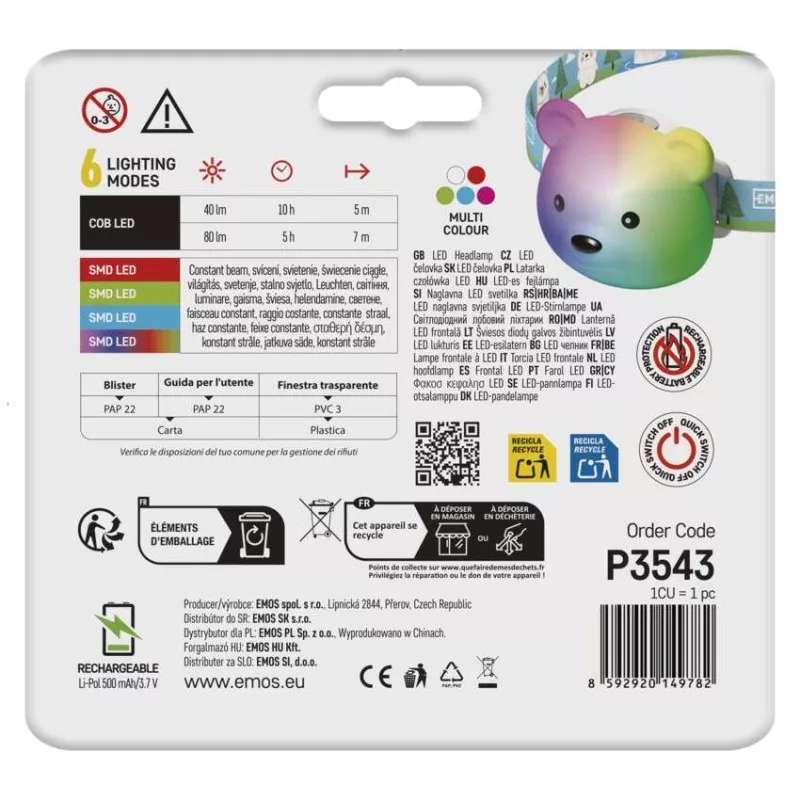 akkumulátor típusa: 500 mAh/3,7 V|anyag: ABS műanyag + szilikon|a töltés LED jelzése: igen|az akkumulátor állapotának LED-es jelzése: nem|elem a csomag része: igen|értékesítési csomagolás: 1 db, papírbliszter|feltöltési idő: 1,5 óra|fényáram: LED 50 % – 40 lm, LED 100 % – 80 lm|fényforrás: LED|fényvisszaverő szalag: nem|fókusz: nem|garancia-időszak: 2 év|jellemzők: –|márka: EMOS|max. hatótávolság: 7 m|maximális fényáram: 80 lm|méretek: 50 × 60 × 37 mm|speciális funkciók: gyors be-/kikapcsolás|sugárzási szög: 180°|súly: 55 g|szín: fehér|táplálás: Li-pol|tartozékok: tápkábel|tölthető: igen|töltőcsatlakozó típusa: USB-C|ütésállóság: igen|üzemidő részletezés: LED 50 % – 10 h, LED 100 % – 5 h|üzemmódok: LED 50%, LED 100%, piros, zöld, kék, multicolor|világítási idő: 5–10 óra|világítási távolság: LED 50 % – 5 m, LED 100 % – 7 m|világítási üzemmódok száma: 6|vízálló: nem