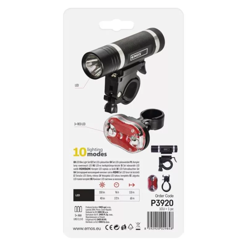 akkumulátor típusa: LR03 (1,5 V)|anyag: első: alumínium, hátsó: műanyag|a töltés LED jelzése: nincs megadva|az akkumulátor állapotának LED-es jelzése: nincs megadva|elem a csomag része: nem|értékesítési csomagolás: 1 db, bliszter|feltöltési idő: nincs megadva|fényáram: LED 100 % – 150 lm, LED 50 % – 40 lm|fényforrás: LED (első), 3× LED (hátsó)|fókusz: nem|garancia-időszak: 2 év|jellemzők: nincs megadva|márka: EMOS|maximális fényárama: 150 lm|max. világítási távolság: 110 m|méretek: 28 × 103 mm, 30 × 65 × 40 mm|speciális funkciók: nincs megadva|súly: nincs megadva|szín: fekete|táplálás: első: 3× AAA, hátsó: 2× AAA|tartozékok: lámpatartó|tölthető: nem|töltőcsatlakozó típusa: nincs megadva|ütésállóság: nincs megadva|üzemidő részletezés: LED 100 % – 96 óra, LED 50 % – 172 óra|üzemmódok: nincs megadva|világítási idő: 96–172 óra|világítási távolság: LED 100 % – 110 m, LED 50 % – 6 m|világítási üzemmódok száma: 10|vízálló: igen (IP43)