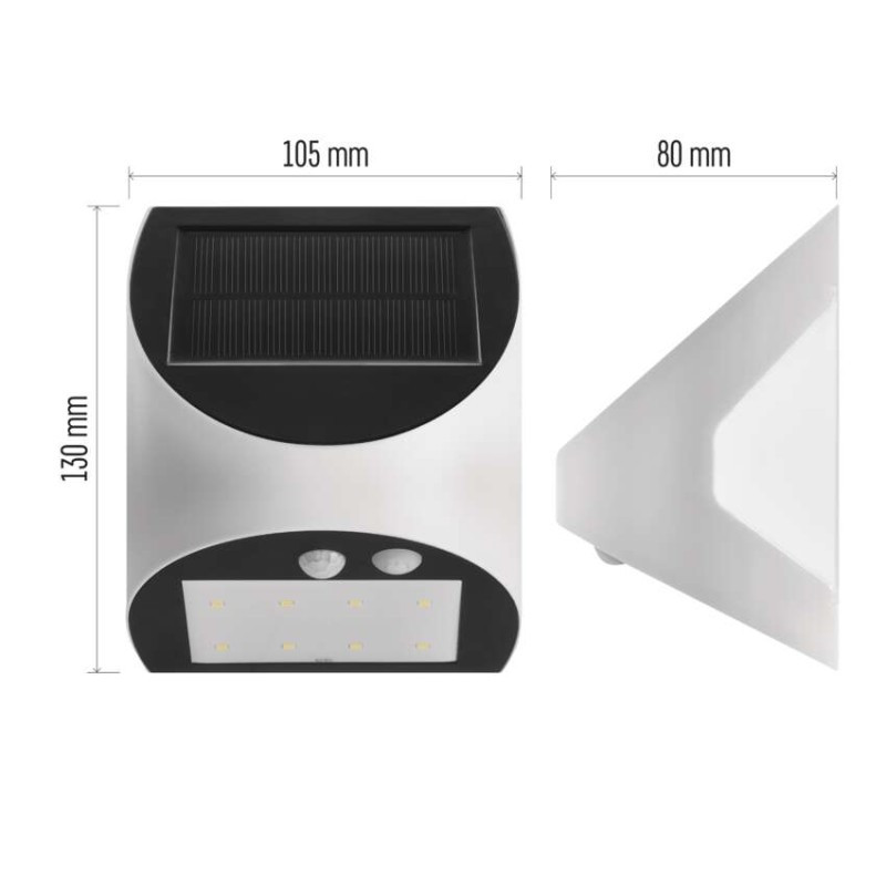 a diffúzor anyaga: műanyag (PC)|a felhasznált fényforrás energiaosztálya: –|a fényerőszabályozás típusa: –|akkumulátor: Li-Ion 1 200 mAh|AKKU világítási idő: 10 óra|áramerősség: –|bevezetőkábel anyaga: –|bevezetőkábel típusa: –|dimmelhetőség: –|élettartam: –|értékesítési csomagolás: 1 db, doboz|fényáram: 240 lm|fényforrás: LED|fényhasznosítás: –|fény színe: természetes fehér|feszültség: 3,7 V|flicker-free: nem villog|fogyasztás: –|frekvencia: –|garancia-időszak: 2 év|használat: felszíni szerelés|kategória: ESSENTIAL|lámpatest: műanyag (ABS+PC)|mechanikai behatás elleni védelem: #|méretek: 105 × 130 × 80 mm|PIR érzékelő: igen|PIR érzékelő hatótávolsága: 5 m|próbaizzó (tartozék): –|sorozat: LUMI|sugárzási szög: 120°|szín: fehér|színhőmérséklet: 4 000 K|színvisszaadási index (CRI): Ra > 80|tápegység-csatlakozók száma: #|tápegység-csatlakozó típusa: #|tápkábel hossza: –|táplálás: solar|teljesítménytényező: #|üzemi hőmérséklet tartomány: #|védettség: IP54