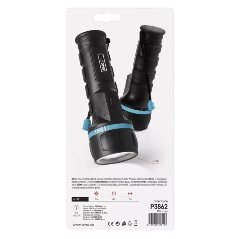 akkumulátor típusa: LR20 (1,5 V)|anyag: műanyag + gumi|a töltés LED jelzése: nincs megadva|az akkumulátor állapotának LED-es jelzése: nincs megadva|elem a csomag része: nem|értékesítési csomagolás: 1 db, papírbliszter|feltöltési idő: nincs megadva|fényáram: LED 100 % – 20 lm|fényforrás: LED|fókusz: nem|garancia-időszak: 2 év|jellemzők: hurok|márka: EMOS|maximális fényárama: 20 lm|max. világítási távolság: 75 m|méretek: 190 × 68 × 68 mm|speciális funkciók: nincs megadva|súly: 216 g|szín: fekete-kék|táplálás: 2× D|tartozékok: nincs megadva|tölthető: nem|töltőcsatlakozó típusa: nincs megadva|ütésállóság: nem|üzemidő részletezés: nincs megadva|üzemmódok: LED 100 %|világítási idő: 140 óra|világítási távolság: LED 100 % – 75 m|világítási üzemmódok száma: 1|vízálló: igen (IP43)