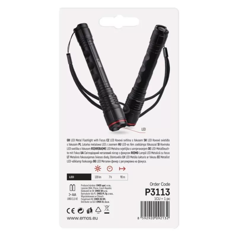 akkumulátor típusa: LR03 (1,5 V)|anyag: alumínium|a töltés LED jelzése: nincs megadva|az akkumulátor állapotának LED-es jelzése: nincs megadva|elem a csomag része: nem|értékesítési csomagolás: 1 db, papírbliszter|feltöltési idő: nincs megadva|fényáram: LED 100 % – 120 lm|fényforrás: LED|fókusz: igen|garancia-időszak: 2 év|jellemzők: hurok|márka: EMOS|maximális fényárama: 120 lm|max. világítási távolság: 90 m|méretek: 131 × 21 × 21 mm|speciális funkciók: nincs megadva|súly: 48 g|szín: fekete|táplálás: 2× AAA|tartozékok: nincs megadva|tölthető: nem|töltőcsatlakozó típusa: nincs megadva|ütésállóság: igen|üzemidő részletezés: LED 100 % – 7 óra|üzemmódok: LED 100 %|világítási idő: 7 óra|világítási távolság: LED 100 % – 90 m|világítási üzemmódok száma: 1|vízálló: igen (IP44)