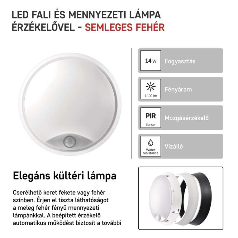 a diffúzor anyaga: műanyag (PC)|a folyosóra és a lépcsőn: igen|a fürdőszobába: igen|a kertre és az erkélyre: igen|a műhelybe és a garázsba: igen|a nappaliba, a hálószobába és a gyerekszobába: nem|áramerősség: 120 mA|áramforrás kimeneti áramerősség: nincs megadva|be a konyhába: nem|diffúzor típusa: tejfehér|élettartam: 25 000 óra|elhelyezés: fali|értékesítési csomagolás: 1 db, doboz|érzékelő hatótávolsága: 10 m|fényáram: 1 100 lm|fényforrás: LED|fényhasznosítás: 71 lm/W|fény színe: természetes fehér|feszültség: 220–240 V|flicker-free: igen|fogyasztás: 14 W|forma: kör|frekvencia: 50/60 Hz|garancia-időszak: 2 év|helyettesítő: 75 W|hivatalba: nem|kategória: CLASSIC|keret színe: fekete/fehér|lámpatest: műanyag (PC)|lámpatest típus: klasszikus lámpatest|LGP anyag: nincs megadva|méretek: 215 × 80 mm átmérővel|mozgásérzékelő: PIR|összeszerelés módja: csatolt|rögzítő nyílás: nincs megadva|sorozat: ZURI|sugárzási szög: 120°|színhőmérséklet: 4 000 K|színvisszaadási index (CRI): Ra > 80|távvezérlő: nem|teljesítménytényező: > 0,5|tompító funkció: nem|UGR<: nincs megadva|védettség: IP54