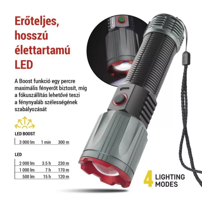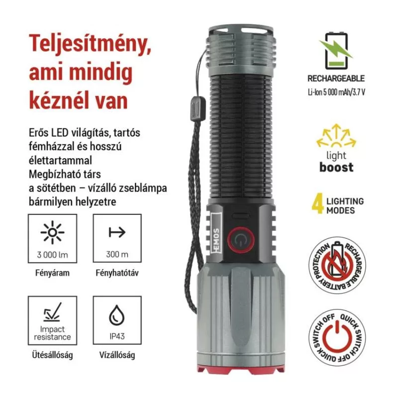 akkumulátor típusa: 5 000 mAh/3,7 V|anyag: alumínium|a töltés LED jelzése: igen|az akkumulátor állapotának LED-es jelzése: igen|elem a csomag része: igen|értékesítési csomagolás: 1 db, doboz|feltöltési idő: 6 óra|fényáram: LED BOOST – 3 000 lm, LED 100 % – 2 000 lm, LED 50 % – 1 000 lm, LED 20 % – 500 lm|fényforrás: LED|fókusz: igen|garancia-időszak: 2 év|jellemzők: hurok|márka: EMOS|maximális fényárama: 3 000 lm|max. világítási távolság: 300 m|méretek: 175 × 45 × 45 mm|speciális funkciók: gyors kikapcsolási funkció, akkumulátor védelmi funkció, powerbank funkció|súly: 360 g|szín: fekete, metál szürke|táplálás: Li-Ion 26650|tartozékok: nincs megadva|tölthető: igen|töltőcsatlakozó típusa: USB-C|ütésállóság: igen|üzemidő részletezés: LED BOOST – 1 min, LED 100 % – 3,5 óra, LED 50 % – 7 óra, LED 20 % – 15 óra|üzemmódok: LED BOOST, LED 100 %, LED 50 %, LED 20 %|világítási idő: 3,5–15 óra|világítási távolság: LED BOOST – 300 m, LED 100 % – 230 m, LED 50 % – 170 m, LED 20 % – 120 m|világítási üzemmódok száma: 4|vízálló: igen (IP43)