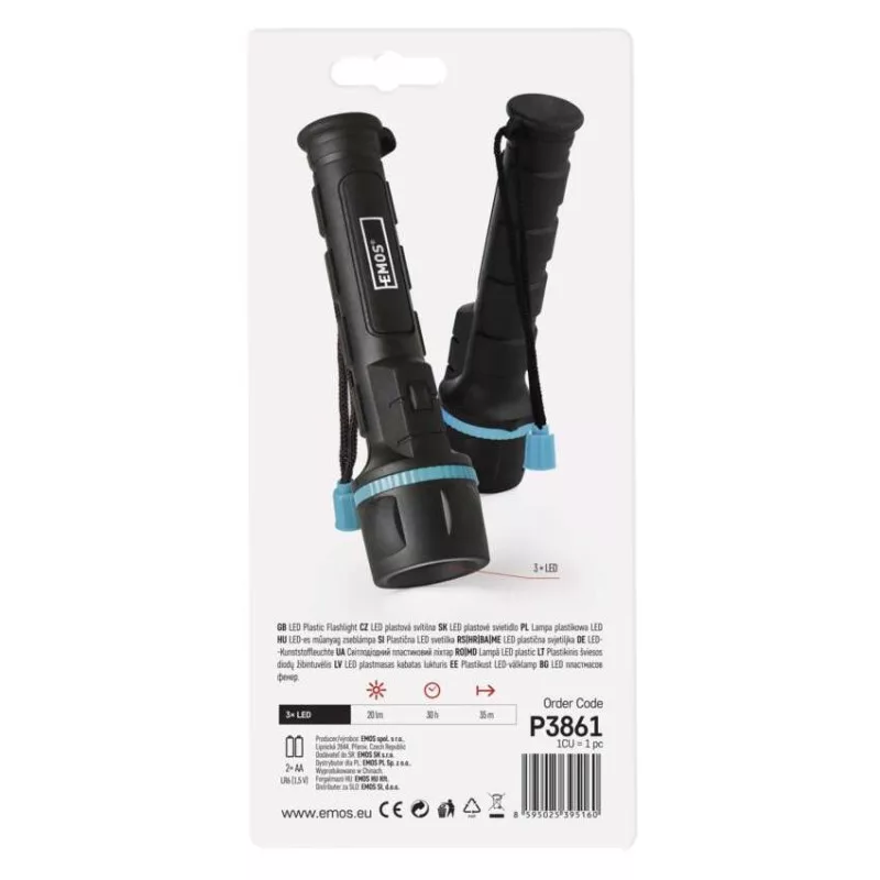 akkumulátor típusa: LR6 (1,5 V)|anyag: műanyag + gumi|a töltés LED jelzése: nincs megadva|az akkumulátor állapotának LED-es jelzése: nincs megadva|elem a csomag része: nem|értékesítési csomagolás: 1 db, papírbliszter|feltöltési idő: nincs megadva|fényáram: LED 100 % – 20 lm|fényforrás: LED|fókusz: nem|garancia-időszak: 2 év|jellemzők: hurok|márka: EMOS|maximális fényárama: 20 lm|max. világítási távolság: 35 m|méretek: 162 × 43 × 43 mm|speciális funkciók: nincs megadva|súly: 85 g|szín: fekete-kék|táplálás: 2× AA|tartozékok: nincs megadva|tölthető: nem|töltőcsatlakozó típusa: nincs megadva|ütésállóság: igen|üzemidő részletezés: nincs megadva|üzemmódok: LED 100 %|világítási idő: 30 óra|világítási távolság: LED 100 % – 35 m|világítási üzemmódok száma: 1|vízálló: igen (IP43)