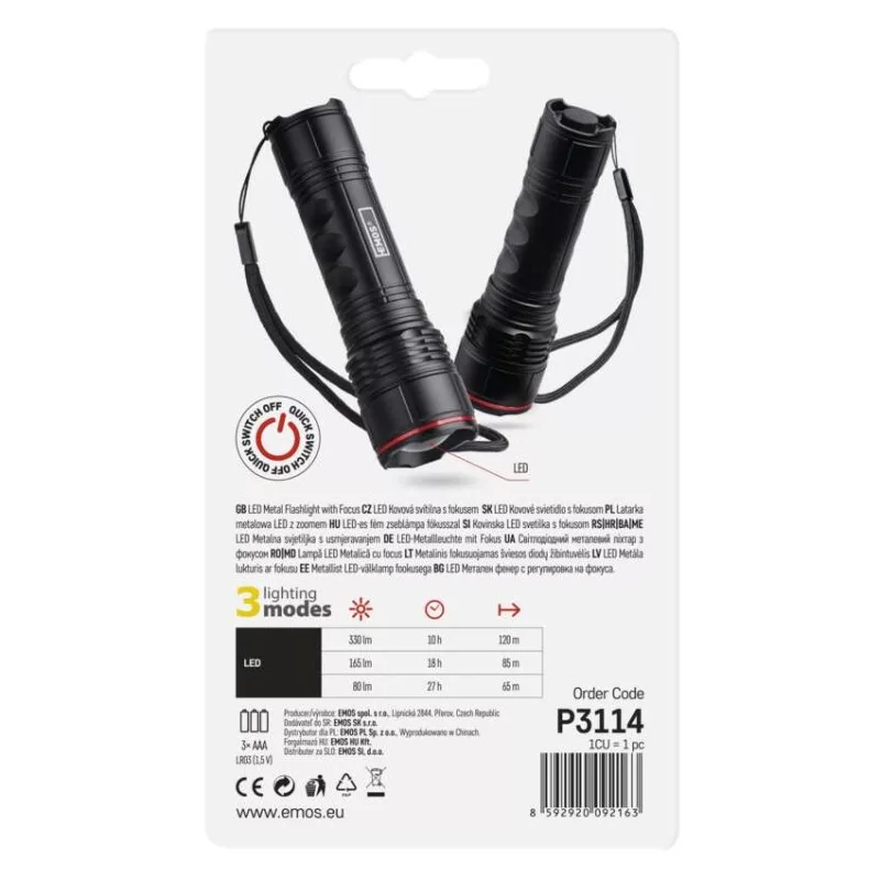 akkumulátor típusa: LR03 (1,5 V)|anyag: alumínium|a töltés LED jelzése: nincs megadva|az akkumulátor állapotának LED-es jelzése: nincs megadva|elem a csomag része: nem|értékesítési csomagolás: 1 db, papírbliszter|feltöltési idő: nincs megadva|fényáram: LED 100 % – 330 lm, LED 50 % – 165 lm, LED 25 % – 80 lm|fényforrás: LED|fókusz: igen|garancia-időszak: 2 év|jellemzők: hurok|márka: EMOS|maximális fényárama: 330 lm|max. világítási távolság: 120 m|méretek: 128 × 37 × 37 mm|speciális funkciók: gyors be-/kikapcsolás|súly: 121 g|szín: fekete|táplálás: 3× AAA|tartozékok: nincs megadva|tölthető: nem|töltőcsatlakozó típusa: nincs megadva|ütésállóság: igen|üzemidő részletezés: LED 100 % – 10 óra, LED 50 % – 18 óra, LED 25 % – 27 óra|üzemmódok: LED 100 %, LED 50 %, LED 25 %|világítási idő: 10–27 óra|világítási távolság: LED 100 % – 120 m, LED 50 % – 85 m, LED 25 % – 65 m|világítási üzemmódok száma: 3|vízálló: igen (IP44)