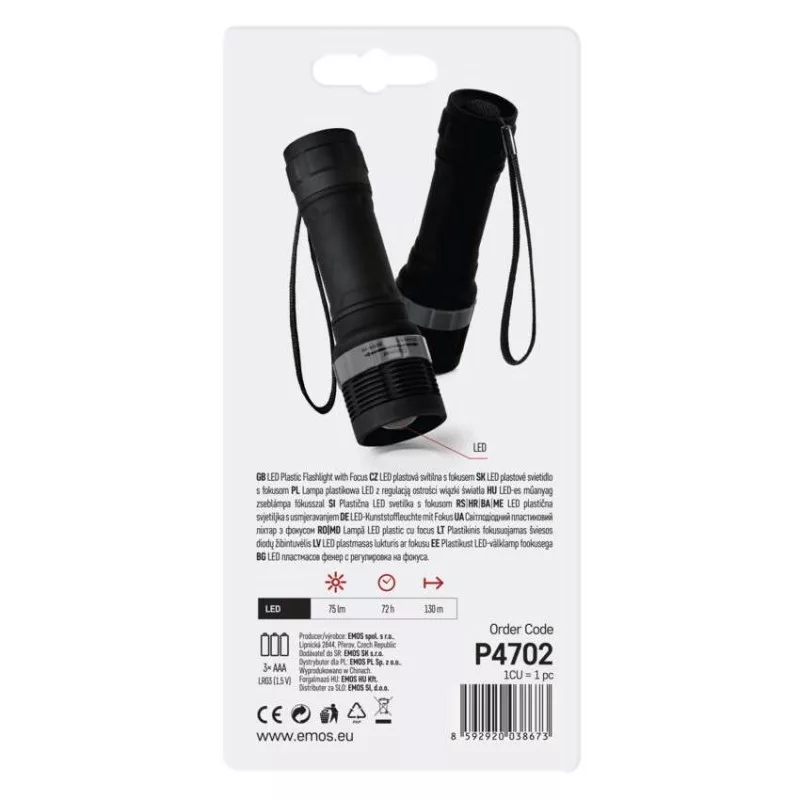akkumulátor típusa: LR03 (1,5 V)|anyag: műanyag|a töltés LED jelzése: nincs megadva|az akkumulátor állapotának LED-es jelzése: nincs megadva|elem a csomag része: nem|értékesítési csomagolás: 1 db, papírbliszter|feltöltési idő: nincs megadva|fényáram: LED 100 % – 75 lm|fényforrás: LED|fókusz: igen|garancia-időszak: 2 év|jellemzők: hurok|márka: EMOS|maximális fényárama: 75 lm|max. világítási távolság: 130 m|méretek: 120 × 35 × 35 mm|speciális funkciók: nincs megadva|súly: 83 g|szín: fekete-szürke|táplálás: 3× AAA|tartozékok: nincs megadva|tölthető: nem|töltőcsatlakozó típusa: nincs megadva|ütésállóság: igen|üzemidő részletezés: nincs megadva|üzemmódok: LED 100 %|világítási idő: 72 óra|világítási távolság: LED 100 % – 130 m|világítási üzemmódok száma: 1|vízálló: igen (IP43)