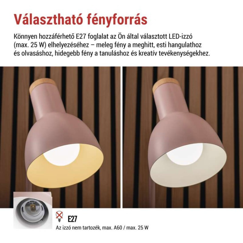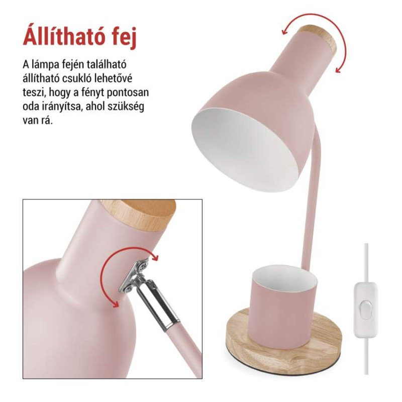 anyag: fém + fa|beépített tölthető elem: nem|bemelegedési idő 100 %-ra: –|dimmelhetőség: nem|élettartam: –|energiaosztály: –|energiaosztály (2021.9. -től): –|értékesítési csomagolás: 1 db, doboz|fényáram: –|fény színe: –|feszültség: 220–230 V AC|foglalat: E27|fogyasztás: 25 W|higanytartalom: –|kapcsolási ciklusok száma: 10 000|LED chip: –|LED-ek száma: 0|max. teljesítmény: 25 W|méretek: 150 × 150 × 400 mm|öregedési tényező: –|szín: rózsaszín|színhőmérséklet: –|színvisszaadási index (CRI): –|tápegység: 220–230 V|tápegység (tartozék): –|tápellátás típusa: elektromos hálózat|tápkábel hossza: 1,5 m|teljesítménytényező: –|USB port: nem|védettség: IP20