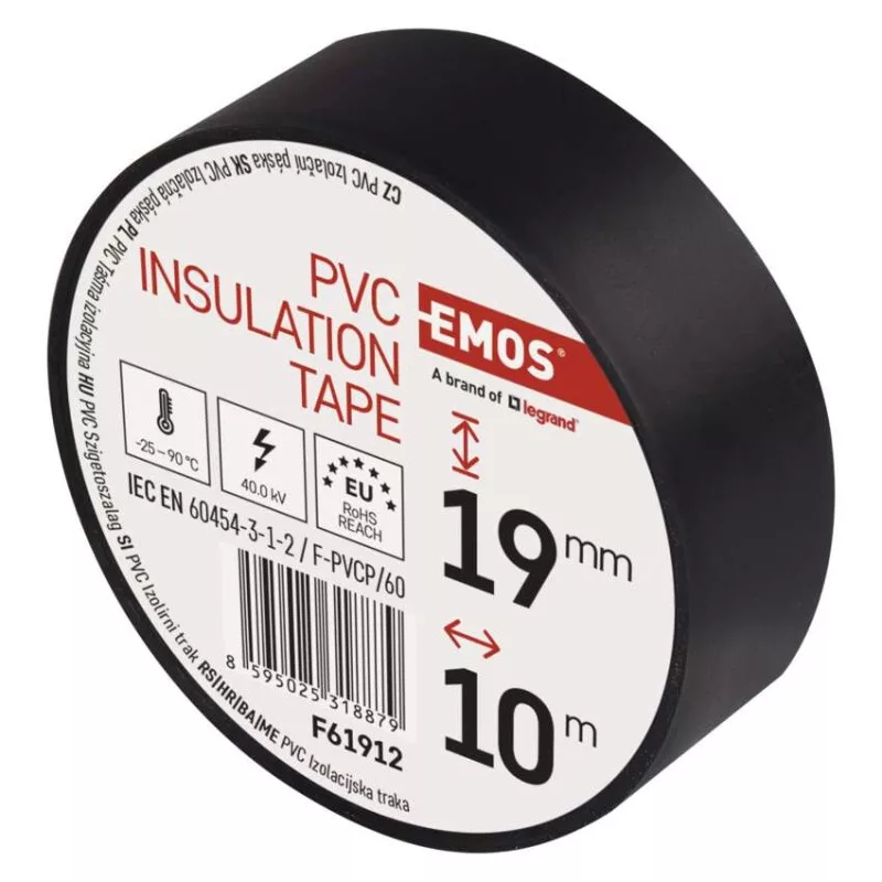 ajánlott tárolási hőmérséklet: 10–45 °C|A REACH irányelveinek megfelelő: igen|A ROHS irányelveinek megfelelő: igen|a szalag szélessége: 19 mm|a szalag vastagsága: 0,13 mm|a tekercs hossza: 10 m|értékesítési csomagolás: 10 db, fólia|integrált szövetháló: nem|javasolt alkalmazás: kábelszigetelés|lángállóság vizsgálat: kevesebb, mint 1 másodperc|maximális megnyúlás: 125 %|megfelel a következő normáknak: ČSN EN 60454-3-1|méretek: 60 × 20 mm|minimális dielektromos (átütési) szilárdság: 40 kV/mm|minimális dielektromos (átütési) szilárdság nedvesedés után: 35 kV/mm|nyomásálló illesztés létrehozása: nem|nyomtatás: nyomtatás nélkül|önoltó: nem|ragasztóanyag: kaucsuk|szakítószilárdság: 150 N/10 mm|szalag típusa: PVC|szín: fekete|tapadás acélhoz - minimális: 1,8 N/10 mm|tapadás az anyaghoz: 1,5 N/10 mm|telepítési hőmérséklet-tartomány: -25–90 °C|UV-ellenálló: igen|vízálló csatlakozás: igen