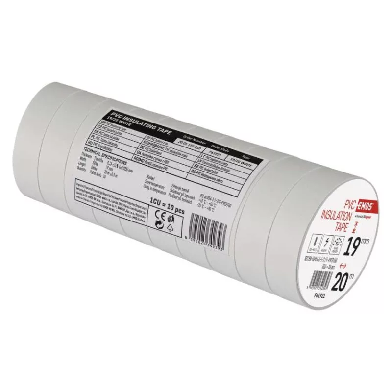 ajánlott tárolási hőmérséklet: 10–45 °C|A REACH irányelveinek megfelelő: igen|A ROHS irányelveinek megfelelő: igen|a szalag szélessége: 19 mm|a szalag vastagsága: 0,13 mm|a tekercs hossza: 20 m|értékesítési csomagolás: 10 db, fólia|integrált szövetháló: nem|javasolt alkalmazás: kábelszigetelés|lángállóság vizsgálat: kevesebb, mint 1 másodperc|maximális megnyúlás: 125 %|megfelel a következő normáknak: ČSN EN 60454-3-1|méretek: 70 × 20 mm|minimális dielektromos (átütési) szilárdság: 40 kV/mm|minimális dielektromos (átütési) szilárdság nedvesedés után: 35 kV/mm|nyomásálló illesztés létrehozása: nem|nyomtatás: nyomtatás nélkül|önoltó: nem|ragasztóanyag: kaucsuk|szakítószilárdság: 150 N/10 mm|szalag típusa: PVC|szín: fehér|tapadás acélhoz - minimális: 1,8 N/10 mm|tapadás az anyaghoz: 1,5 N/10 mm|telepítési hőmérséklet-tartomány: -25–90 °C|UV-ellenálló: igen|vízálló csatlakozás: igen