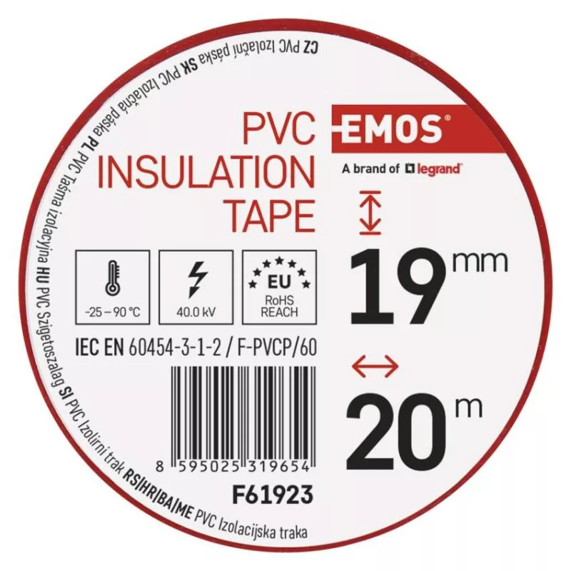 ajánlott tárolási hőmérséklet: 10–45 °C|A REACH irányelveinek megfelelő: igen|A ROHS irányelveinek megfelelő: igen|a szalag szélessége: 19 mm|a szalag vastagsága: 0,13 mm|a tekercs hossza: 20 m|értékesítési csomagolás: 10 db, fólia|integrált szövetháló: nem|javasolt alkalmazás: kábelszigetelés|lángállóság vizsgálat: kevesebb, mint 1 másodperc|maximális megnyúlás: 125 %|megfelel a következő normáknak: ČSN EN 60454-3-1|méretek: 70 × 20 mm|minimális dielektromos (átütési) szilárdság: 40 kV/mm|minimális dielektromos (átütési) szilárdság nedvesedés után: 35 kV/mm|nyomásálló illesztés létrehozása: nem|nyomtatás: nyomtatás nélkül|önoltó: nem|ragasztóanyag: kaucsuk|szakítószilárdság: 150 N/10 mm|szalag típusa: PVC|szín: piros|tapadás acélhoz - minimális: 1,8 N/10 mm|tapadás az anyaghoz: 1,5 N/10 mm|telepítési hőmérséklet-tartomány: -25–90 °C|UV-ellenálló: igen|vízálló csatlakozás: igen