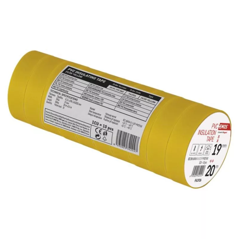 ajánlott tárolási hőmérséklet: 10–45 °C|A REACH irányelveinek megfelelő: igen|A ROHS irányelveinek megfelelő: igen|a szalag szélessége: 19 mm|a szalag vastagsága: 0,13 mm|a tekercs hossza: 20 m|értékesítési csomagolás: 10 db, fólia|integrált szövetháló: nem|javasolt alkalmazás: kábelszigetelés|lángállóság vizsgálat: kevesebb, mint 1 másodperc|maximális megnyúlás: 125 %|megfelel a következő normáknak: ČSN EN 60454-3-1-2/F-PVC/60|méretek: 70 × 20 mm|minimális dielektromos (átütési) szilárdság: 40 kV/mm|minimális dielektromos (átütési) szilárdság nedvesedés után: 35 kV/mm|nyomásálló illesztés létrehozása: nem|nyomtatás: nyomtatás nélkül|önoltó: nem|ragasztóanyag: kaucsuk|szakítószilárdság: 150 N/10 mm|szalag típusa: PVC|szín: sárga|tapadás acélhoz - minimális: 1,8 N/10 mm|tapadás az anyaghoz: 1,5 N/10 mm|telepítési hőmérséklet-tartomány: -25–90 °C|UV-ellenálló: igen|vízálló csatlakozás: igen