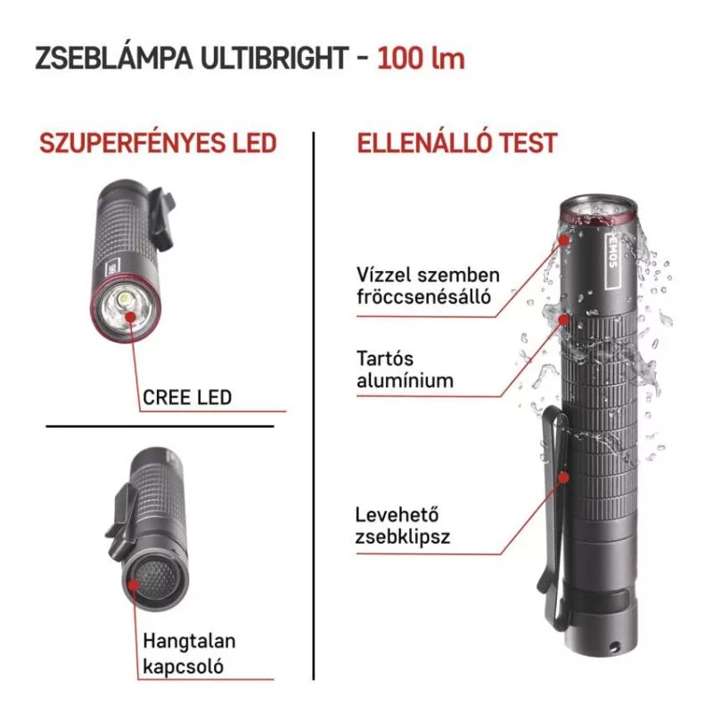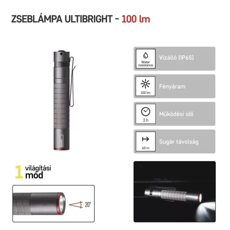 akkumulátor típusa: LR03 (1,5 V)|anyag: alumínium|a töltés LED jelzése: nincs megadva|az akkumulátor állapotának LED-es jelzése: nincs megadva|elem a csomag része: nem|értékesítési csomagolás: 1 db, doboz|feltöltési idő: nincs megadva|fényáram: CREE LED 100 % – 100 lm|fényforrás: CREE LED|fókusz: nem|garancia-időszak: 3 év|jellemzők: klipp, hurok|márka: EMOS|maximális fényárama: 100 lm|max. világítási távolság: 65 m|méretek: 98 × 16 × 16 mm|speciális funkciók: nincs megadva|súly: 32 g|szín: szürke|táplálás: 1× AAA|tartozékok: nincs megadva|tölthető: nem|töltőcsatlakozó típusa: nincs megadva|ütésállóság: igen|üzemidő részletezés: CREE LED 100 % – 3 h|üzemmódok: CREE LED 100 %|világítási idő: 3 óra|világítási távolság: CREE LED 100 % – 65 m|világítási üzemmódok száma: 1|vízálló: igen (IP65)