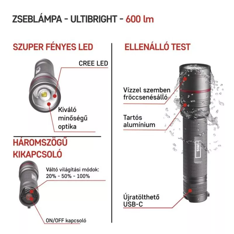 akkumulátor típusa: 2 600 mAh/3,7 V|anyag: alumínium|a töltés LED jelzése: igen|az akkumulátor állapotának LED-es jelzése: nem|elem a csomag része: igen|értékesítési csomagolás: 1 db, doboz|feltöltési idő: 4,5 óra|fényáram: CREE LED 100 % – 600 lm, CREE LED 50 % – 300 lm, CREE LED 20 % – 130 lm|fényforrás: CREE LED|fókusz: igen (csavarozás)|garancia-időszak: 3 év|jellemzők: hurok|márka: EMOS|maximális fényárama: 600 lm|max. világítási távolság: 230 m|méretek: 151 × 34 × 34 mm|speciális funkciók: gyors kikapcsolás funkció, akkumulátorvédelmi funkció|súly: 189 g|szín: szürke|táplálás: Li-Ion 18650|tartozékok: tok|tölthető: igen|töltőcsatlakozó típusa: USB C|ütésállóság: igen|üzemidő részletezés: CREE LED 100 % – 3,5 h, CREE LED 50 % – 5,5 h, CREE LED 20 % – 12 h|üzemmódok: CREE LED 100 %, CREE LED 50 %, CREE LED 20 %|világítási idő: 3,5–12 óra|világítási távolság: CREE LED 100 % – 230 m, CREE LED 50 % – 150 m, CREE LED 20 % – 100 m|világítási üzemmódok száma: 3|vízálló: igen (IP65)