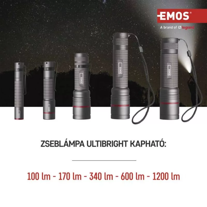 akkumulátor típusa: 5 000 mAh/3,7 V|anyag: alumínium|a töltés LED jelzése: igen|az akkumulátor állapotának LED-es jelzése: nem|elem a csomag része: igen|értékesítési csomagolás: 1 db, doboz|feltöltési idő: 11,5 óra|fényáram: CREE LED 100 % – 1 200 lm, CREE LED 50 % – 600 lm, CREE LED 20 % – 260 lm|fényforrás: CREE LED|fókusz: igen (csavarozás)|garancia-időszak: 3 év|jellemzők: hurok|márka: EMOS|maximális fényárama: 1 200 lm|max. világítási távolság: 280 m|méretek: 157 × 40 × 40 mm|speciális funkciók: gyors kikapcsolás funkció, akkumulátorvédelmi funkció|súly: 295 g|szín: szürke|táplálás: Li-Ion 26650|tartozékok: tok|tölthető: igen|töltőcsatlakozó típusa: USB C|ütésállóság: igen|üzemidő részletezés: CREE LED 100 % – 3 h, CREE LED 50 % – 4,5 h, CREE LED 20 % – 11 h|üzemmódok: CREE LED 100 %, CREE LED 50 %, CREE LED 20 %|világítási idő: 3–11 óra|világítási távolság: CREE LED 100 % – 280 m, CREE LED 50 % – 200 m, CREE LED 20 % – 130 m|világítási üzemmódok száma: 3|vízálló: igen (IP65)