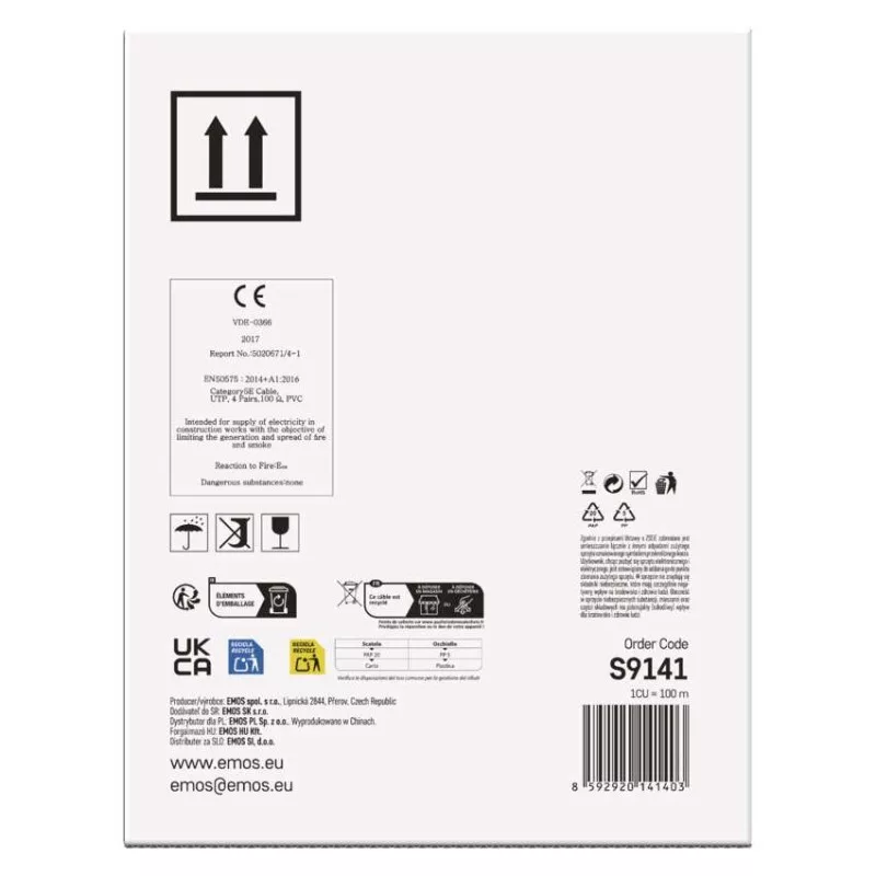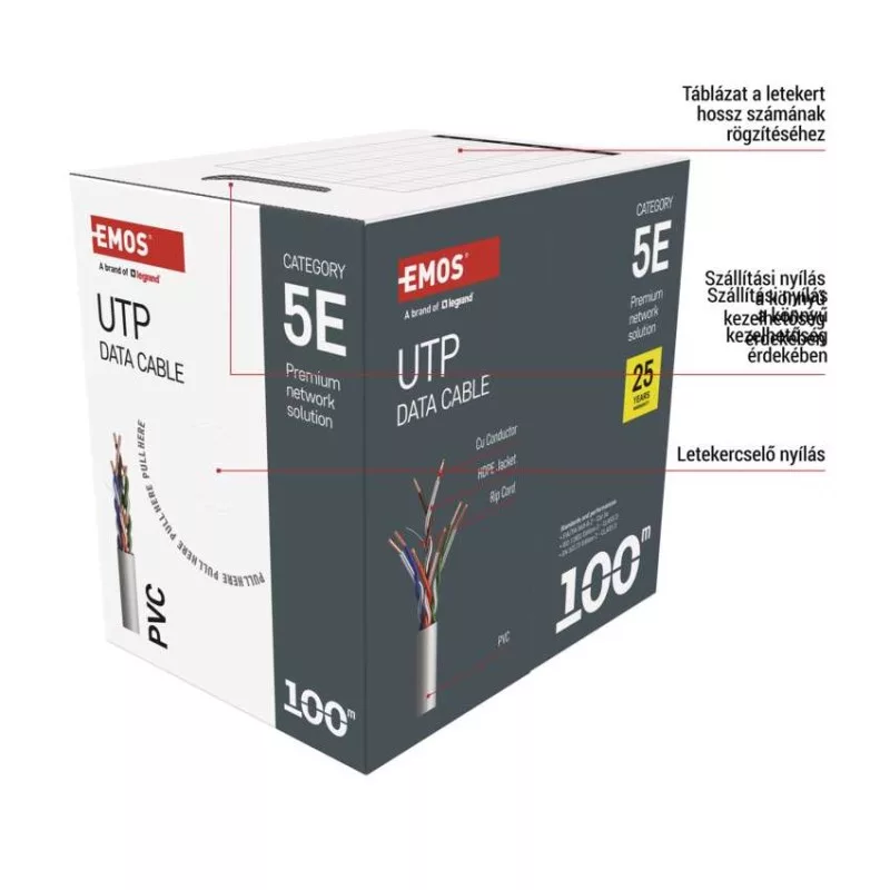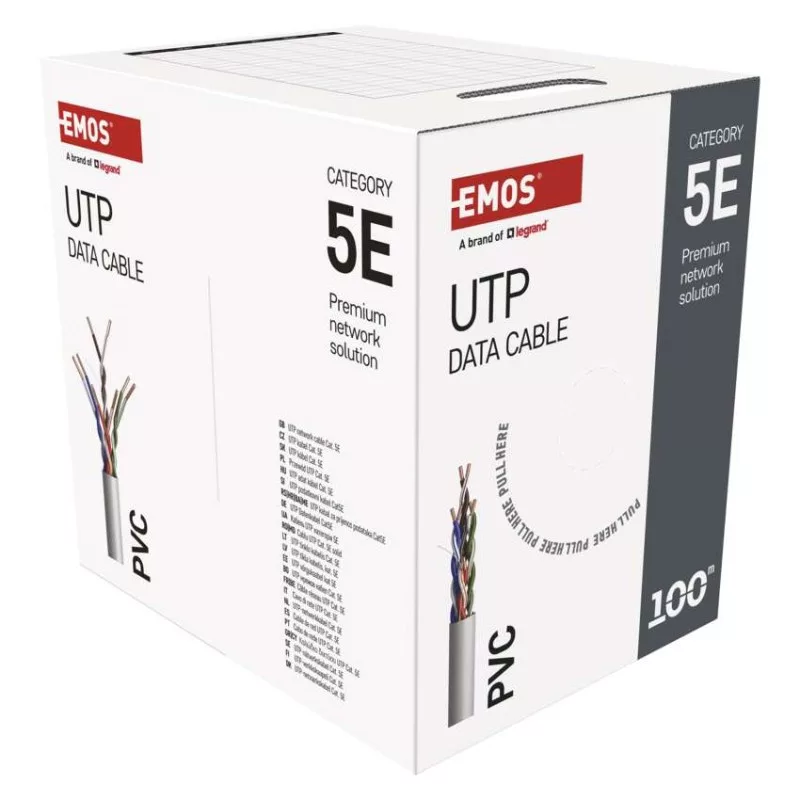 a belső vezeték anyaga: vörösréz (Cu)|árnyékolás: nem|AWG: 24|belső vezető ér átmérője: 0,48 mm|csatlakozók: nincs megadva|csatlakozó védő típusa: nincs megadva|értékesítési csomagolás: 100 m, papír doboz|garancia-időszak: 25 év|használat: professional|hossz: 100 m|kábelátmérő: 5 mm|kábelburkolat vastagsága: 1,0 mm|kábelhez tervezve: nincs megadva|kábel jelölése: UTP Cat5E PVC 1 – 100 m|kábelköpeny: PVC|kábelszerkezet: vezeték|kategória: CAT5E|köpeny kevesebb füstkibocsátással LSZH (LS0H): nem|köpeny színe: szürke (RAL 7035)|legmagasabb támogatott protokoll: 1000 Base-TX (Gigabit Ethernet)|maximális üzemi nedvesség: 93 %|rögzítési hőmérséklet: +5 °C és +60 °C|szilárdsági elem: nincs megadva|tárolási hőmérséklet: -20 °C és +60 °C|termék: UTP kábel csatlakozók nélkül|típus: UTP CAT 5E PVC|tűzveszélyességi osztály: Eca|veszélyes anyagok: nincs|vezetékek száma: 8|vezeték szigetelése: HDPE|vezető ér szigetelésének vastagsága: 0,22 mm