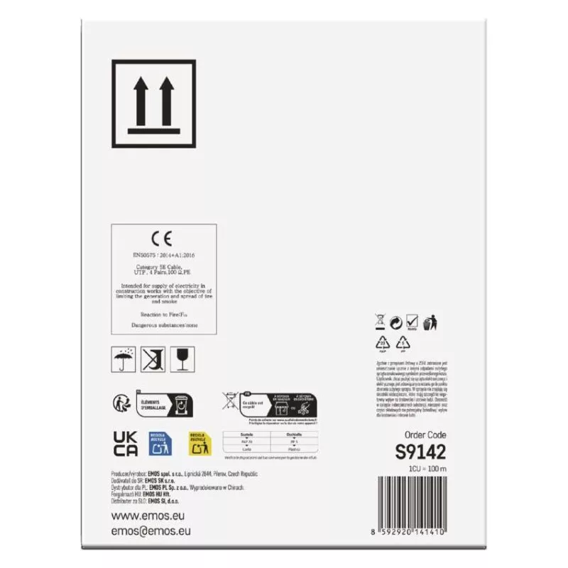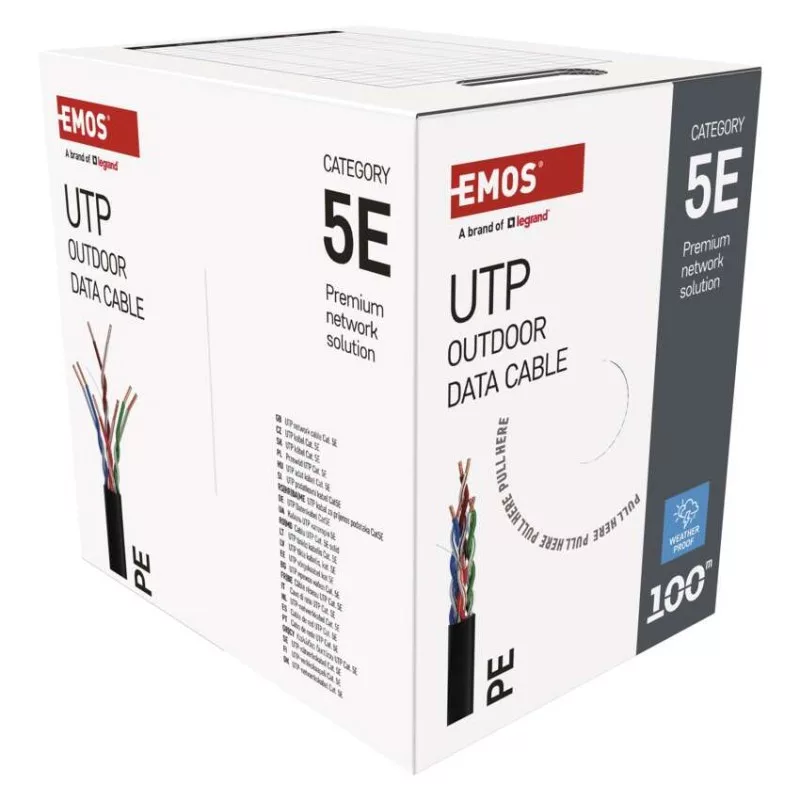 a belső vezeték anyaga: vörösréz (Cu)|árnyékolás: nem|AWG: 24|belső vezető ér átmérője: 0,48 mm|csatlakozók: nem|csatlakozó védő típusa: –|értékesítési csomagolás: 100 m, papír doboz|garancia-időszak: 25 év|használat: professional|hossz: 100 m|kábelátmérő: 5 mm|kábelburkolat vastagsága: 1,0 mm|kábelhez tervezve: –|kábel jelölése: UTP Cat5E PE OUTDOOR 1 – 100 m|kábelköpeny: PE|kábelszerkezet: vezeték|kategória: CAT5E|köpeny kevesebb füstkibocsátással LSZH (LS0H): nem|köpeny színe: fekete (RAL 9005)|legmagasabb támogatott protokoll: 1000 Base-TX (Gigabit Ethernet)|maximális üzemi nedvesség: 93 %|rögzítési hőmérséklet: +5 °C és +60 °C|szilárdsági elem: –|tárolási hőmérséklet: -20 °C és +60 °C|termék: UTP kábel csatlakozók nélkül|típus: UTP CAT 5E PE|tűzveszélyességi osztály: Eca|veszélyes anyagok: nincs|vezetékek száma: 8|vezeték szigetelése: HDPE|vezető ér szigetelésének vastagsága: 0,22 mm