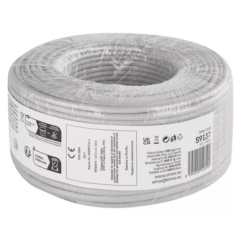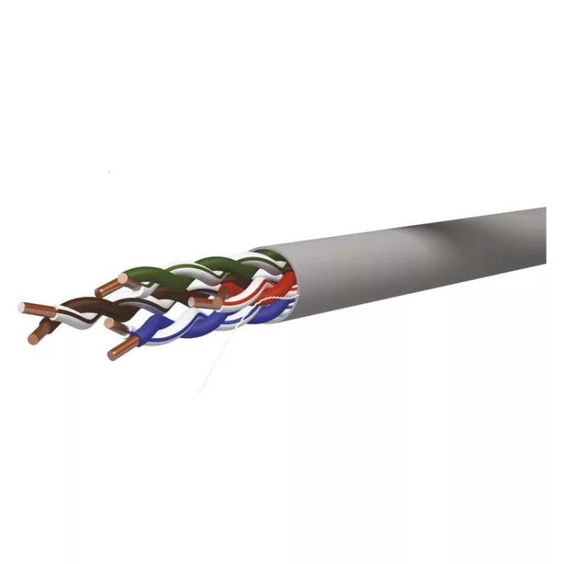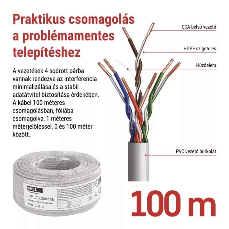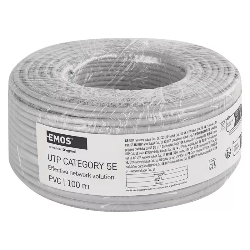 a belső vezeték anyaga: rézzel bevont alumínium (CCA)|árnyékolás: nem|AWG: 24|belső vezető ér átmérője: 0,48 mm|csatlakozók: nincs megadva|csatlakozó védő típusa: nincs megadva|értékesítési csomagolás: 100 m, fólia|garancia-időszak: 2 év|használat: beltéri|hossz: 100 m|kábelátmérő: 5,0 mm|kábelburkolat vastagsága: 1,0 mm|kábelhez tervezve: nincs megadva|kábel jelölése: UTP Cat5E PVC 1 – 100 m|kábelköpeny: PVC|kábelszerkezet: vezeték|kategória: CAT5E|köpeny kevesebb füstkibocsátással LSZH (LS0H): nem|köpeny színe: szürke (RAL 7035)|legmagasabb támogatott protokoll: 1000 Base-T (Gigabit Ethernet)|maximális üzemi nedvesség: 93 %|rögzítési hőmérséklet: +5 °C és +60 °C|szilárdsági elem: Nylon 150D|tárolási hőmérséklet: -20 °C és +60 °C|termék: UTP kábel csatlakozók nélkül|típus: UTP CAT 5E CCA OEM|tűzveszélyességi osztály: Eca|veszélyes anyagok: nincs|vezetékek száma: 8|vezeték szigetelése: HDPE|vezető ér szigetelésének vastagsága: 0,21 mm