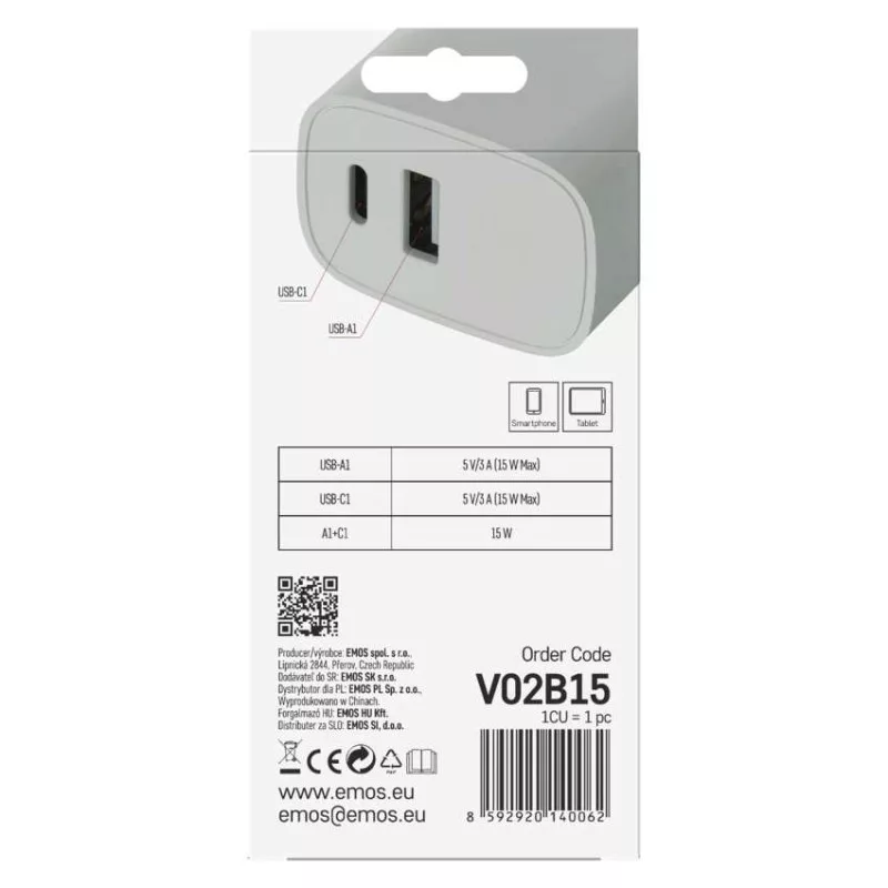 a csatlakozó mérete: nincs megadva|akkumulátor kapacitása: nincs megadva|akkumulátor típusa: nincs megadva|a következő termékekhez tervezett: okostelefon, táblagép|a LED-es lámpa funkciója: nincs megadva|áramfelvétel - üresjáratban: nincs megadva|bemeneti feszültség: 100–240 V~ 50/60 Hz|értékesítési csomagolás: 1 db, kis papír doboz|kábel: nem|kimeneti áram: nincs megadva|kimeneti feszültség: nincs megadva|LED akkumulátor állapot jelző: nincs megadva|LED jelzőfények: nem|LED töltés jelző: nincs megadva|maximális terhelés – állandó: nincs megadva|maximális terhelés – csúcson: nincs megadva|max. teljesítmény 1 db USB: A: 5 V/3 A (15 W); C: 5 V/3 A (15 W)|max. teljesítmény összesen: 15 W|méretek: 35 × 72 × 22 mm|súly: 45 g|szín: fehér|tápellátás típusa: nincs megadva|termék: USB adapter|töltés: basic|túlterhelés, túlfeszültség és rövidzárlat elleni védelem: igen|USB kimenetek száma: 2