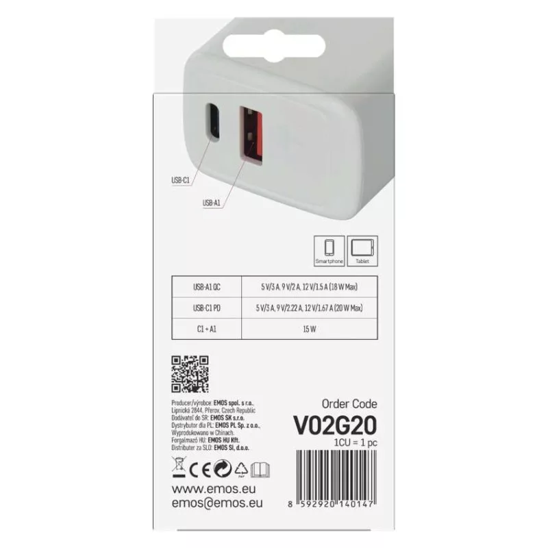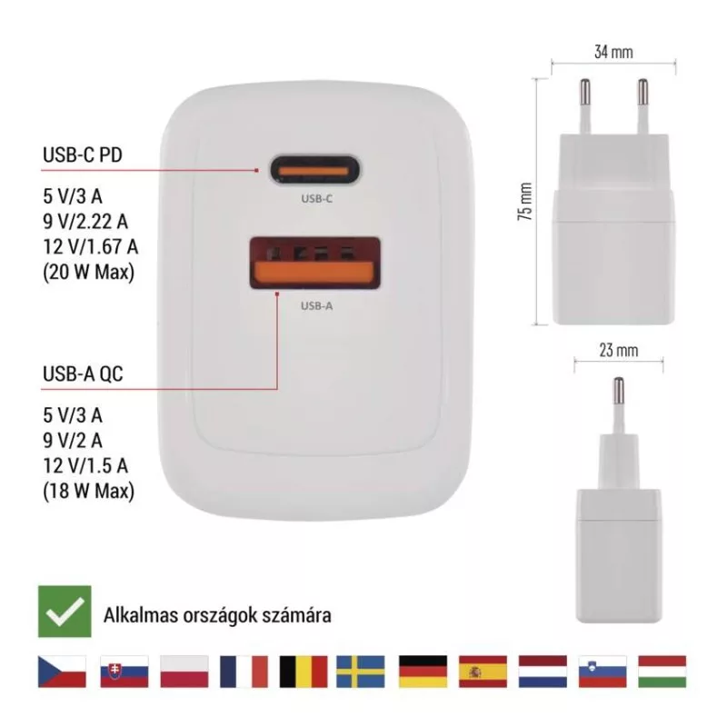 a csatlakozó mérete: nincs megadva|akkumulátor kapacitása: nincs megadva|akkumulátor típusa: nincs megadva|a következő termékekhez tervezett: okostelefon, táblagép|a LED-es lámpa funkciója: nincs megadva|áramfelvétel - üresjáratban: nincs megadva|bemeneti feszültség: 100–240 V~ 50/60 Hz|értékesítési csomagolás: 1 db, kis papír doboz|kábel: nem|kimeneti áram: nincs megadva|kimeneti feszültség: nincs megadva|LED akkumulátor állapot jelző: nincs megadva|LED jelzőfények: nem|LED töltés jelző: nincs megadva|maximális terhelés – állandó: nincs megadva|maximális terhelés – csúcson: nincs megadva|max. teljesítmény 1 db USB: A: 5 V/3 A – 9 V/2 A – 12 V/1,5 A (18 W); C: 5 V/3 A – 9 V/2,22 A – 12 V/1,67 A (20 W)|max. teljesítmény összesen: 20 W|méretek: 34 × 75 × 23 mm|súly: 48 g|szín: fehér|tápellátás típusa: nincs megadva|termék: USB adapter|töltés: fast|túlterhelés, túlfeszültség és rövidzárlat elleni védelem: igen|USB kimenetek száma: 2