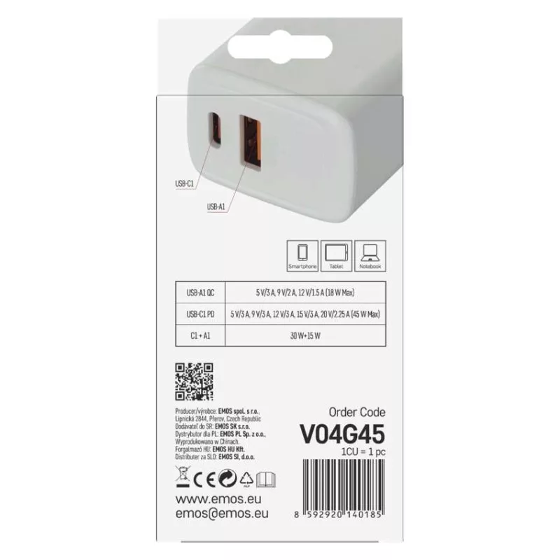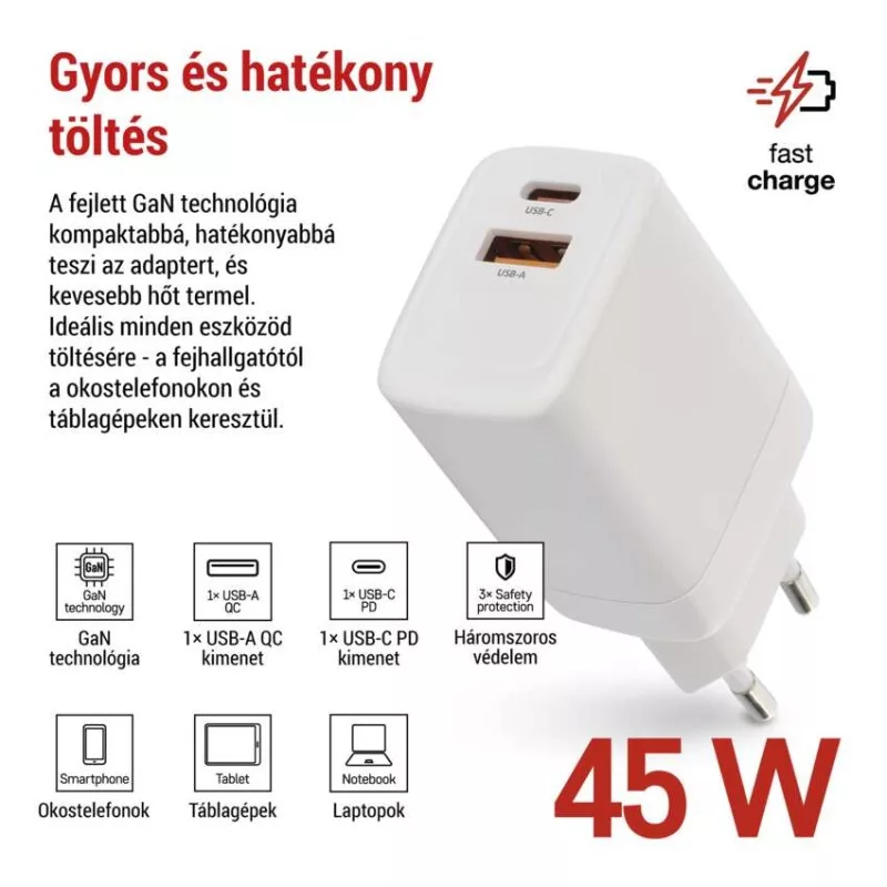 a csatlakozó mérete: nincs megadva|akkumulátor kapacitása: nincs megadva|akkumulátor típusa: nincs megadva|a következő termékekhez tervezett: smartphone, tablet, notebook|a LED-es lámpa funkciója: nincs megadva|áramfelvétel - üresjáratban: nincs megadva|bemeneti feszültség: 100–240 V~ 50/60 Hz|értékesítési csomagolás: 1 db, kis papír doboz|kábel: nem|kimeneti áram: nincs megadva|kimeneti feszültség: nincs megadva|LED akkumulátor állapot jelző: nincs megadva|LED jelzőfények: nem|LED töltés jelző: nincs megadva|maximális terhelés – állandó: nincs megadva|maximális terhelés – csúcson: nincs megadva|max. teljesítmény 1 db USB: A: 5 V/3 A – 9 V/2 A – 12 V/1,5 A (18 W); C: 5 V/3 A – 9 V/3 A – 12 V/3 A – 15 V/3 A – 20 V/2,25 A (45 W)|max. teljesítmény összesen: 45 W|méretek: 34 × 84 × 23 mm|súly: 79 g|szín: fehér|tápellátás típusa: nincs megadva|termék: USB adapter|töltés: fast|túlterhelés, túlfeszültség és rövidzárlat elleni védelem: igen|USB kimenetek száma: 2