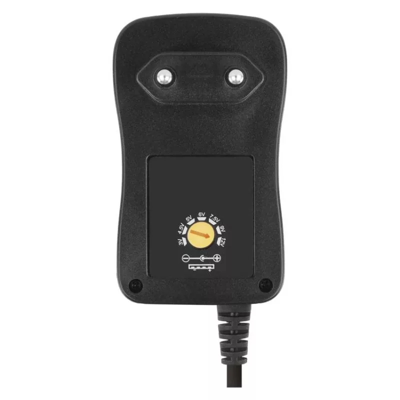 a csatlakozó mérete: B 3,5/15; C 3,0x1,0/10; D 5,0x2,1/12; G 5,5x2,5/13; H 3,5x1,35/11; I 4x 1,7/12; S 2,35x0,75/8,7|akkumulátor kapacitása: –|akkumulátor típusa: –|a következő termékekhez tervezett: univerzális|a LED-es lámpa funkciója: –|áramfelvétel - üresjáratban: –|bemeneti feszültség: 100–240 V~ 50/60 Hz|értékesítési csomagolás: 1 db, kis doboz|kábel: 1,8 m|kimeneti áram: max. 1 000 mA|kimeneti feszültség: 3 V, 4,5 V, 5 V, 6 V, 7,5 V, 9 V, 12 V|LED akkumulátor állapot jelző: –|LED jelzőfények: igen|LED töltés jelző: –|maximális terhelés – állandó: –|maximális terhelés – csúcson: –|max. teljesítmény 1 db USB: 5 V/2,0 A/10 W|max. teljesítmény összesen: 5 V/2,0 A/10 W|méretek: 50 × 84 × 71 mm|súly: 120 g|szín: fekete|tápellátás típusa: kábel + DC csatlakozókészlet + kimeneti USB|termék: univerzális forrás pulzáló|töltés: –|túlterhelés, túlfeszültség és rövidzárlat elleni védelem: igen|USB kimenetek száma: 1