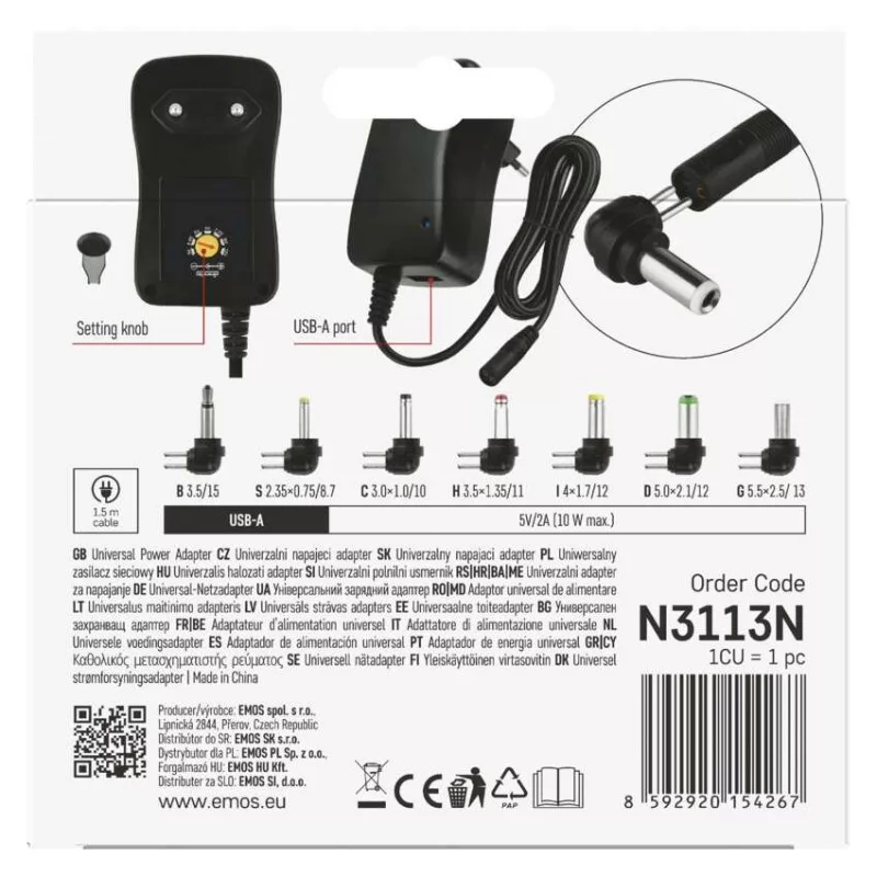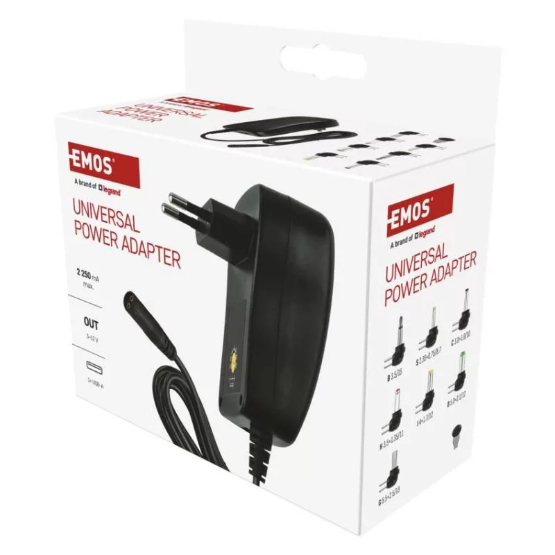 a csatlakozó mérete: B 3,5/15; C 3,0x1,0/10; D 5,0x2,1/12; G 5,5x2,5/13; H 3,5x1,35/11; I 4x 1,7/12; S 2,35x0,75/8,7|akkumulátor kapacitása: –|akkumulátor típusa: –|a következő termékekhez tervezett: univerzális|a LED-es lámpa funkciója: –|áramfelvétel - üresjáratban: –|bemeneti feszültség: 100–240 V~ 50/60 Hz|értékesítési csomagolás: 1 db, kis doboz|kábel: 1,8 m|kimeneti áram: max. 2 250 mA|kimeneti feszültség: 3 V, 4,5 V, 5 V, 6 V, 7,5 V, 9 V, 12 V|LED akkumulátor állapot jelző: –|LED jelzőfények: igen|LED töltés jelző: –|maximális terhelés – állandó: –|maximális terhelés – csúcson: –|max. teljesítmény 1 db USB: 5 V/2,0 A/10 W|max. teljesítmény összesen: 5 V/2,0 A/10 W|méretek: 50 × 84 × 71 mm|súly: 120 g|szín: fekete|tápellátás típusa: kábel + DC csatlakozókészlet + kimeneti USB|termék: univerzális forrás pulzáló|töltés: –|túlterhelés, túlfeszültség és rövidzárlat elleni védelem: igen|USB kimenetek száma: 1