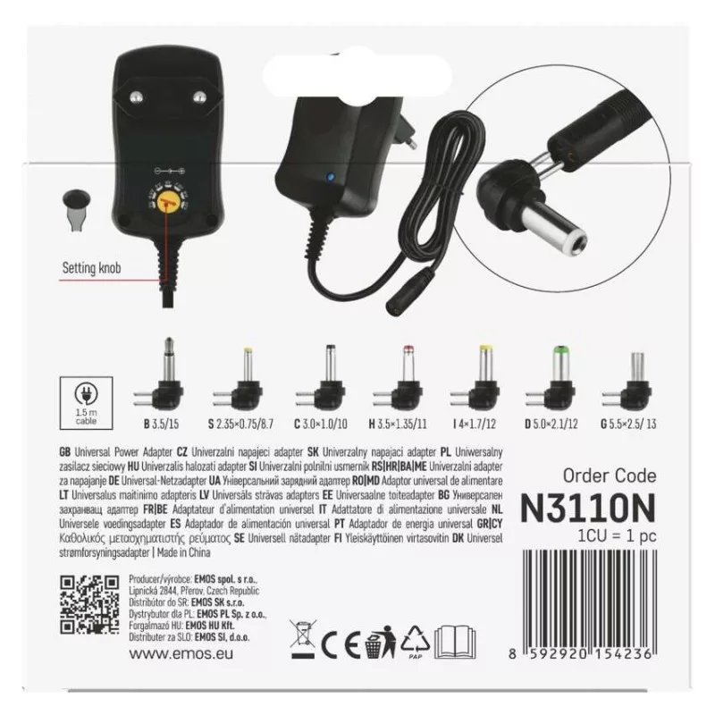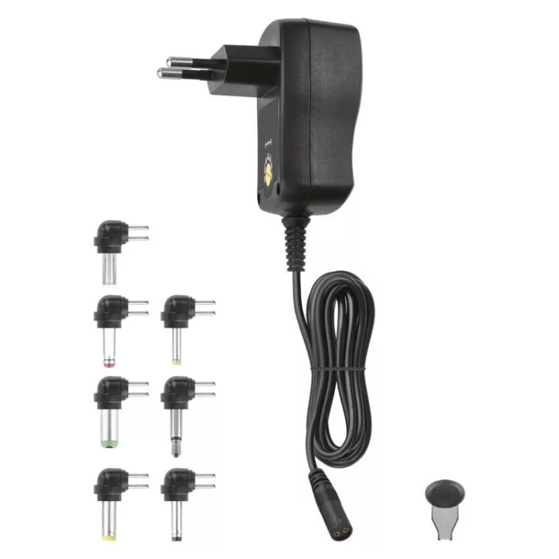 a csatlakozó mérete: B 3,5/15; C 3,0x1,0/10; D 5,0x2,1/12; G 5,5x2,5/13; H 3,5x1,35/11; I 4x 1,7/12; S 2,35x0,75/8,7|akkumulátor kapacitása: –|akkumulátor típusa: –|a következő termékekhez tervezett: univerzális|a LED-es lámpa funkciója: –|áramfelvétel - üresjáratban: –|bemeneti feszültség: 100–240 V~ 50/60 Hz|értékesítési csomagolás: 1 db, kis doboz|kábel: 1,8 m|kimeneti áram: max. 600 mA|kimeneti feszültség: 3 V, 4,5 V, 5 V, 6 V, 7,5 V, 9 V, 12 V|LED akkumulátor állapot jelző: –|LED jelzőfények: igen|LED töltés jelző: –|maximális terhelés – állandó: –|maximális terhelés – csúcson: –|max. teljesítmény 1 db USB: –|max. teljesítmény összesen: –|méretek: 37 × 66 × 67 mm|súly: 78 g|szín: fekete|tápellátás típusa: kábel + DC csatlakozókészlet|termék: univerzális forrás pulzáló|töltés: –|túlterhelés, túlfeszültség és rövidzárlat elleni védelem: igen|USB kimenetek száma: 0