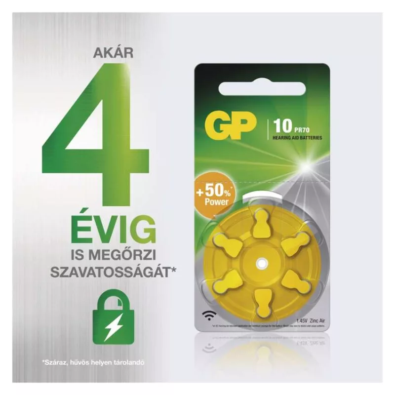 akkumulátor mérete: nincs megadva|értékesítési csomagolás: 6 db, bliszter|feszültség: 1,45 V|kapacitás: 90 mAh (1,5 kohm-os terhelés esetén)|kategória/sorozat: Hearing Aid|kémiai összetétel: cink-levegő|márka: GP|max. tárolási idő: 3 év|méretek: 5,8 × 3,6 mm|súly: 0,3 g|típus: GP ZA10 (7005ZD, PR70)|töltési ciklusok száma: nem tölthető|tölthető: nem|üzemi hőmérséklet: -10 °C és +50 °C