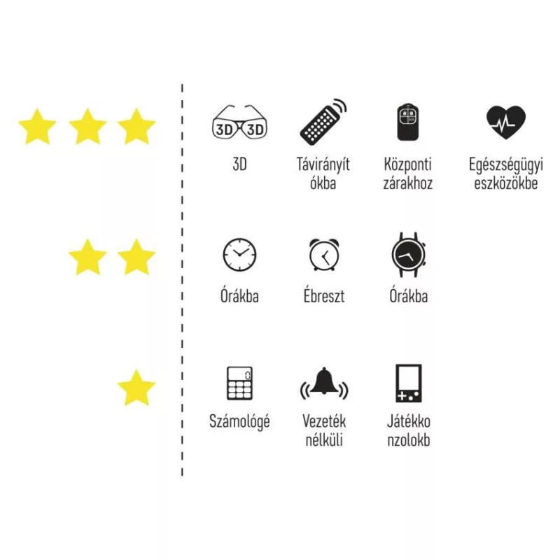 Különösen széles, -10 °C és +60 °C közötti működési hőmérséklet-tartomány. Megfelel az érzékeny eszközökben történő használatra, mint például: karórák, számológépek, biztonsági világítás, gépkocsiriasztók, nyomásmérők, távirányítók és egyebek. Különösen hosszú, akár 10 éves eltarthatósági idő. CR 2032