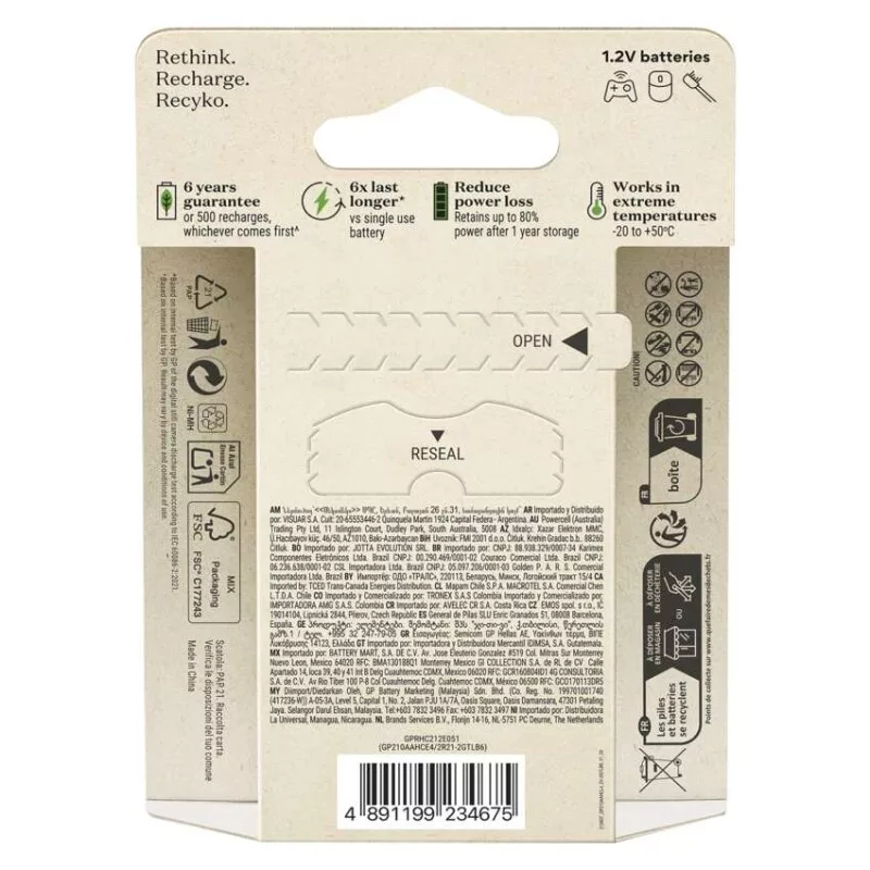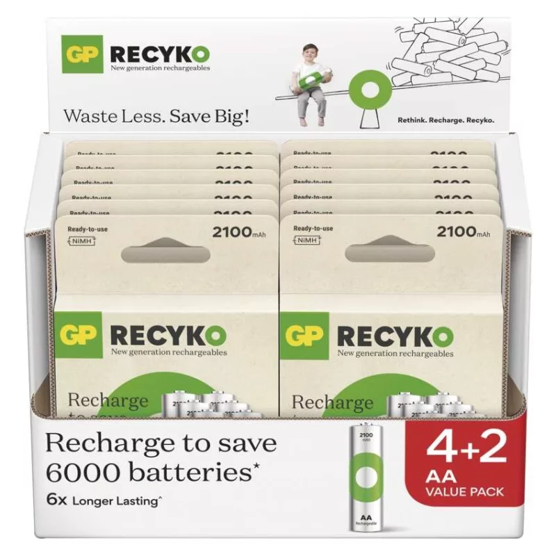 akkumulátor mérete: AA|értékesítési csomagolás: 6 db, kis papír doboz|feszültség: 1,2 V|kapacitás: 2 100 mAh|kategória/sorozat: Tölthető|kémiai összetétel: NiMH|márka: GP|max. tárolási idő: nincs megadva|méretek: 14,5 × 50,5 mm|súly: 27 g|típus: HR6 (AA ceruza)|töltési ciklusok száma: több, mint 500|tölthető: igen|üzemi hőmérséklet: -20 °C és +50 °C