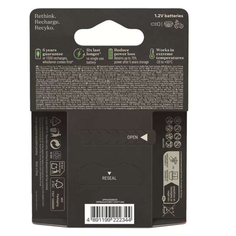 akkumulátor mérete: AAA|értékesítési csomagolás: 6 db, kis papír doboz|feszültség: 1,2 V|kapacitás: 800 mAh|kategória/sorozat: ReCyko Pro|kémiai összetétel: NiMH|márka: GP|max. tárolási idő: nincs megadva|méretek: 10,5 × 44,5 mm|súly: 14 g|típus: HR03 (AAA mikroceruza)|töltési ciklusok száma: több, mint 1 500|tölthető: igen|üzemi hőmérséklet: -20 °C és +50 °C